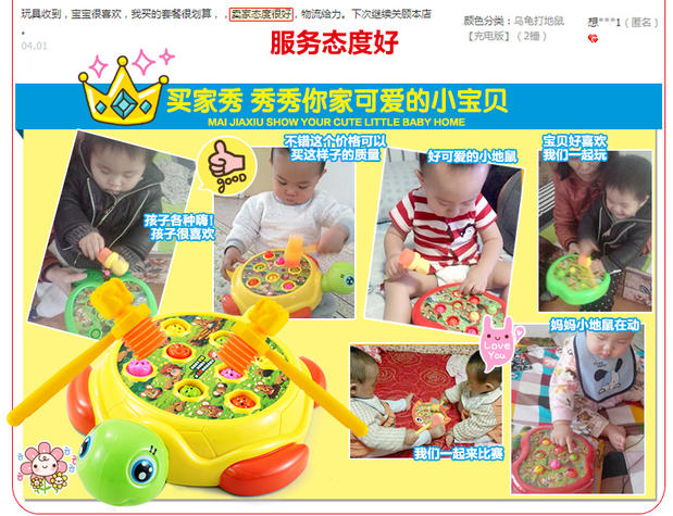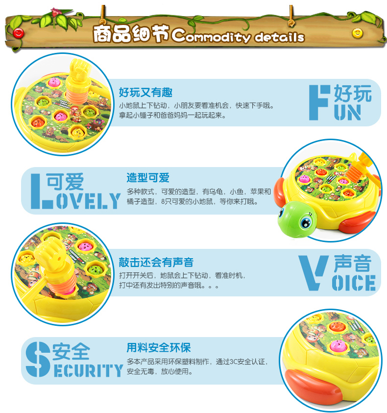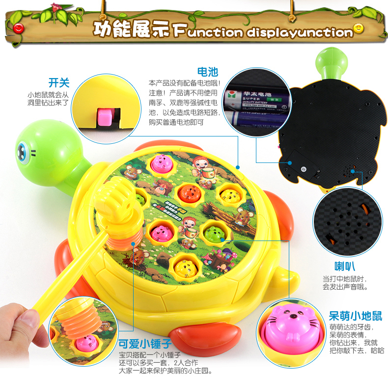 電動(dòng)玩具/音樂(lè)系列 。適用年齡: 12個(gè)月 2歲 3歲 4歲 5歲 6歲;中性玩具類(lèi)型: 塑膠玩具顏色分類(lèi): 烏龜打地鼠【送電池+2錘】