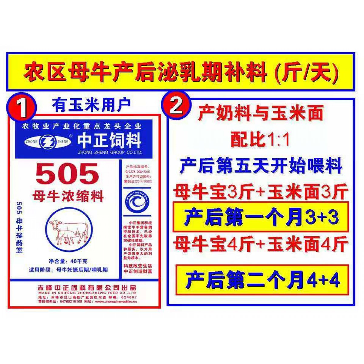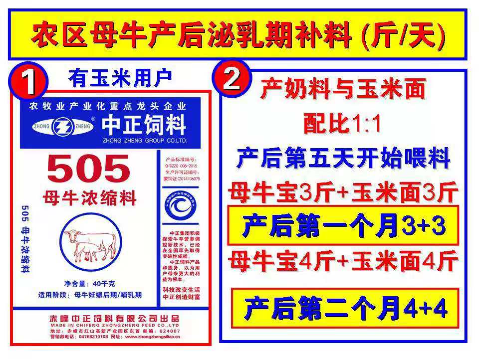 中正母牛濃縮料。505的特點是,產(chǎn)奶多發(fā)情快,產(chǎn)后五天之后開始喂。1斤料+1斤玉米面。一天兩次。逐漸加料。10天以后1.5斤飼料+1.5斤玉米面。第一個月的目標是泌乳保鏢。母牛產(chǎn)后第二月飼養(yǎng)的目標是增乳發(fā)情。第二個月是產(chǎn)奶高峰期,泌乳次數(shù)增多。牛犢越長越大,越吃越多。第二個月是增乳發(fā)情的關(guān)鍵時期。所以一次2斤飼料+2斤玉米面,一天兩次。母牛產(chǎn)后。90%以上。30多天到50多天發(fā)情準備。