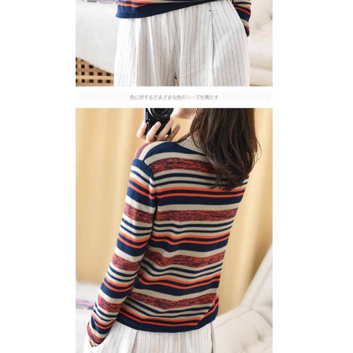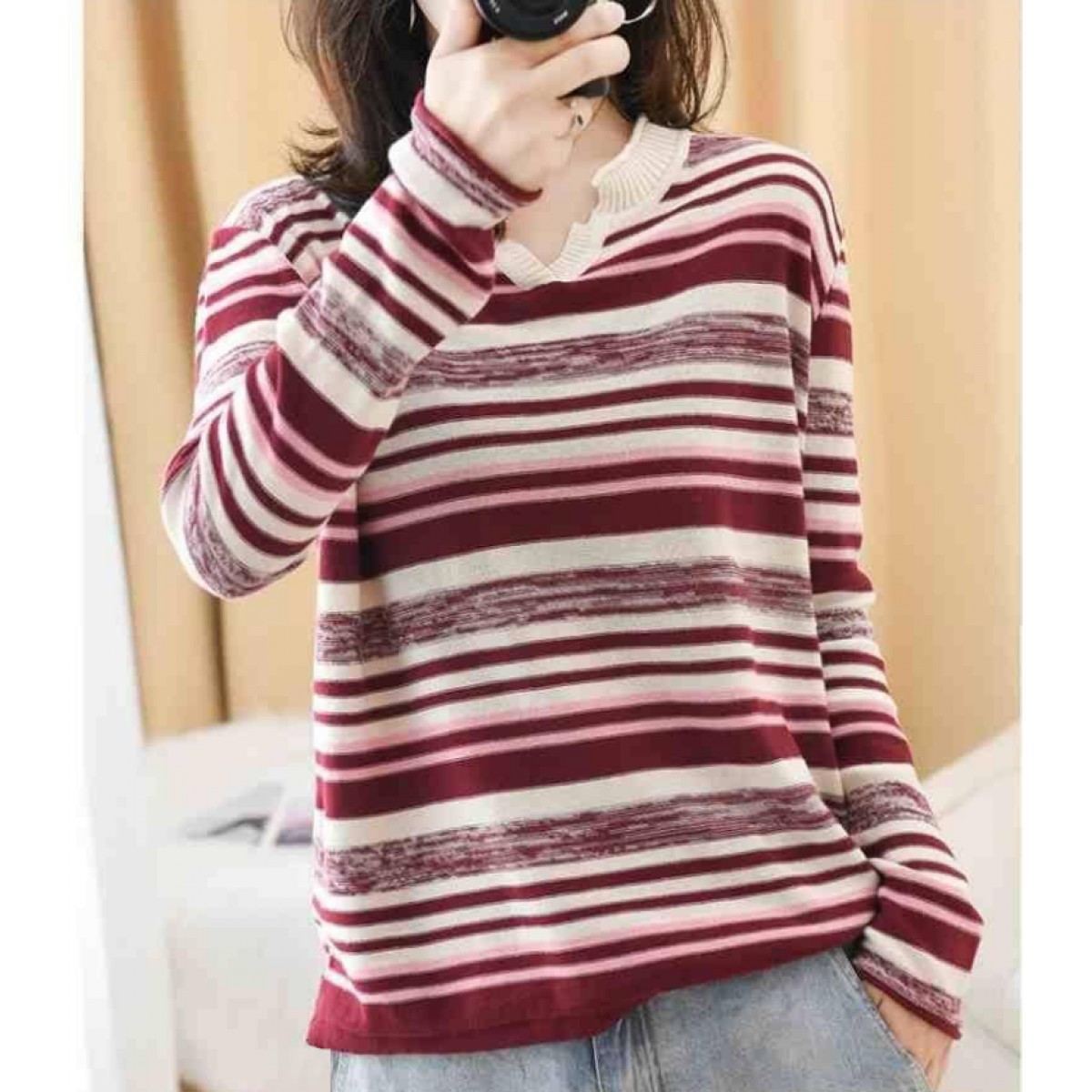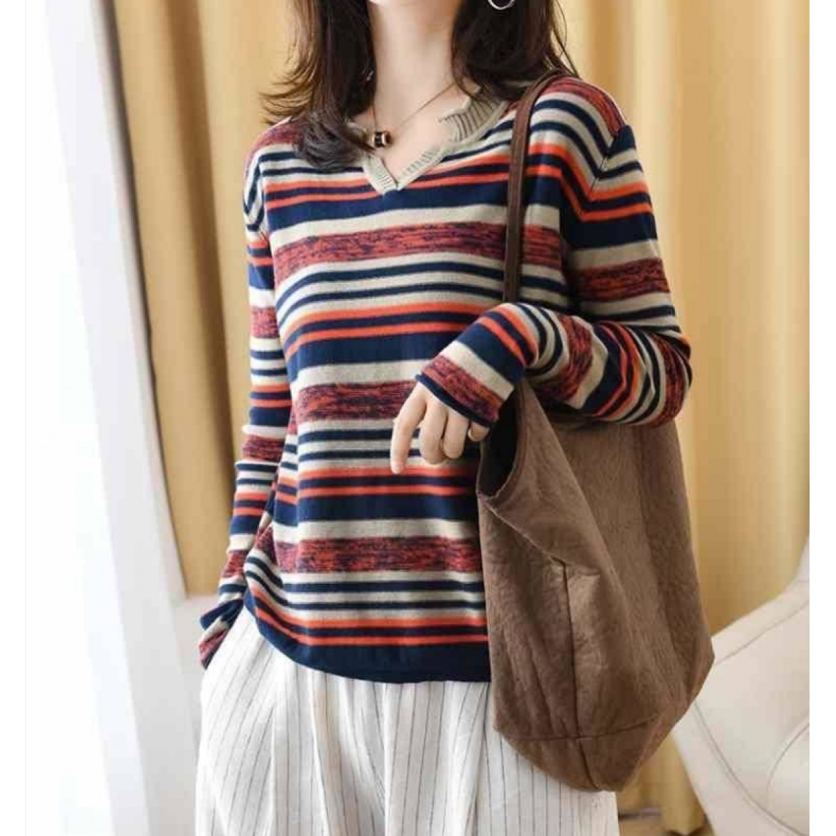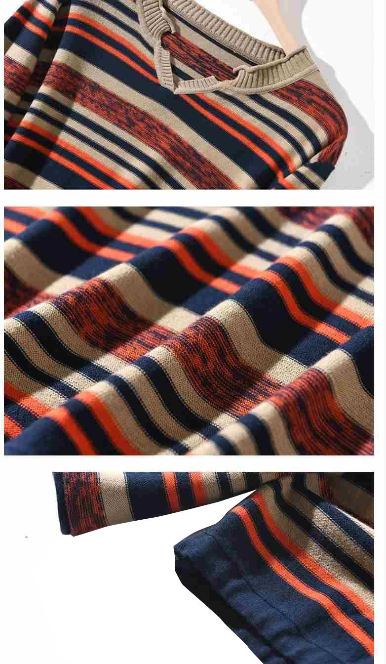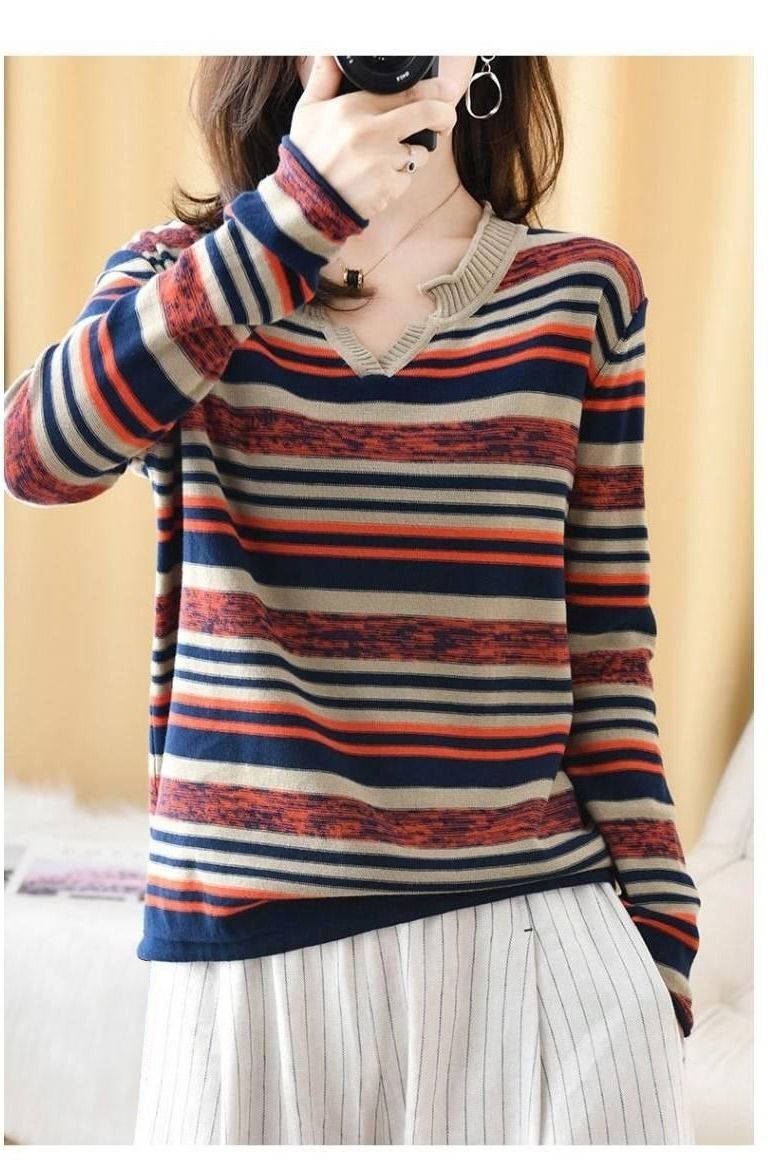 商品名稱:新款2019秋v領(lǐng)針織長(zhǎng)袖女裝寬松毛衣上衣條紋針織衫薄款打底衫