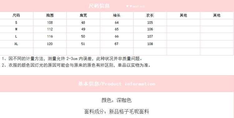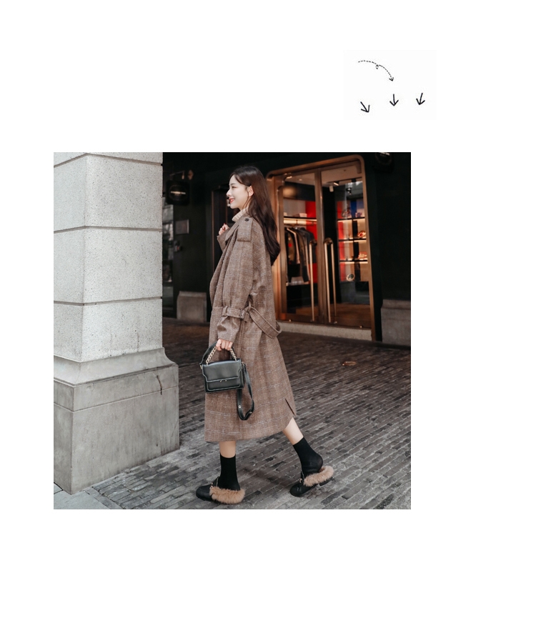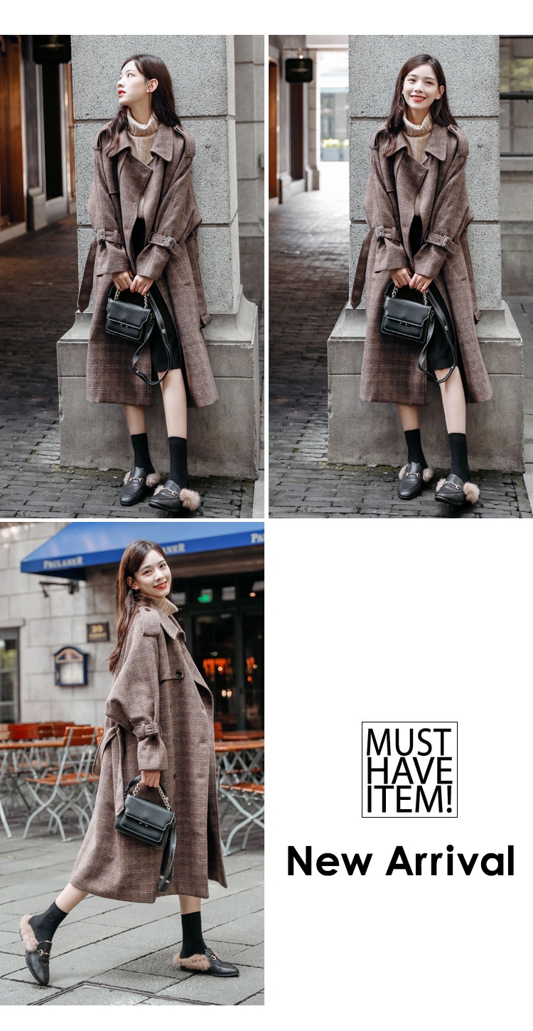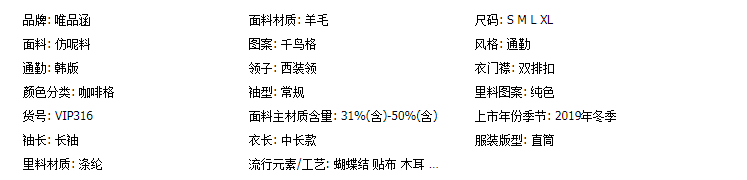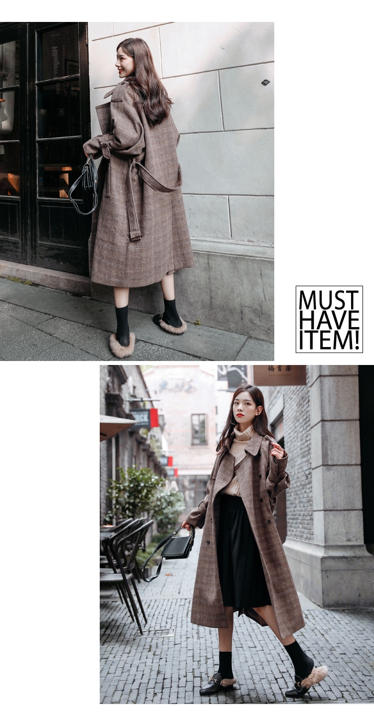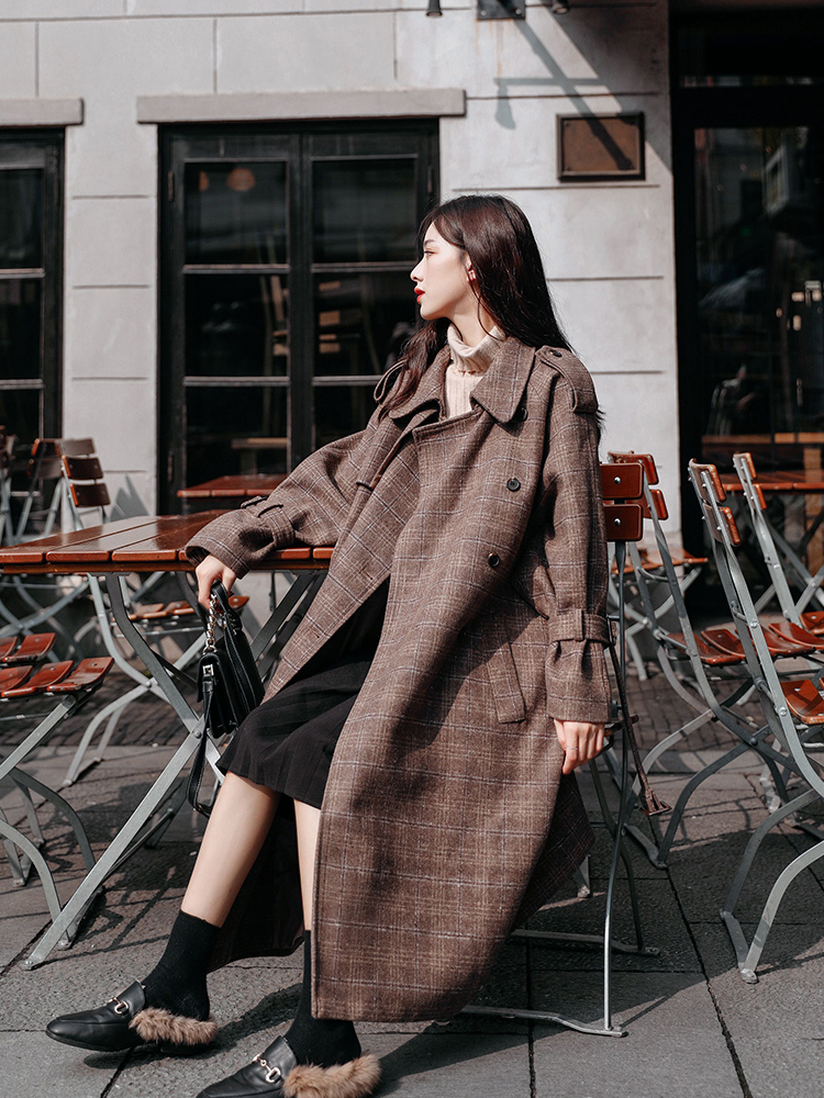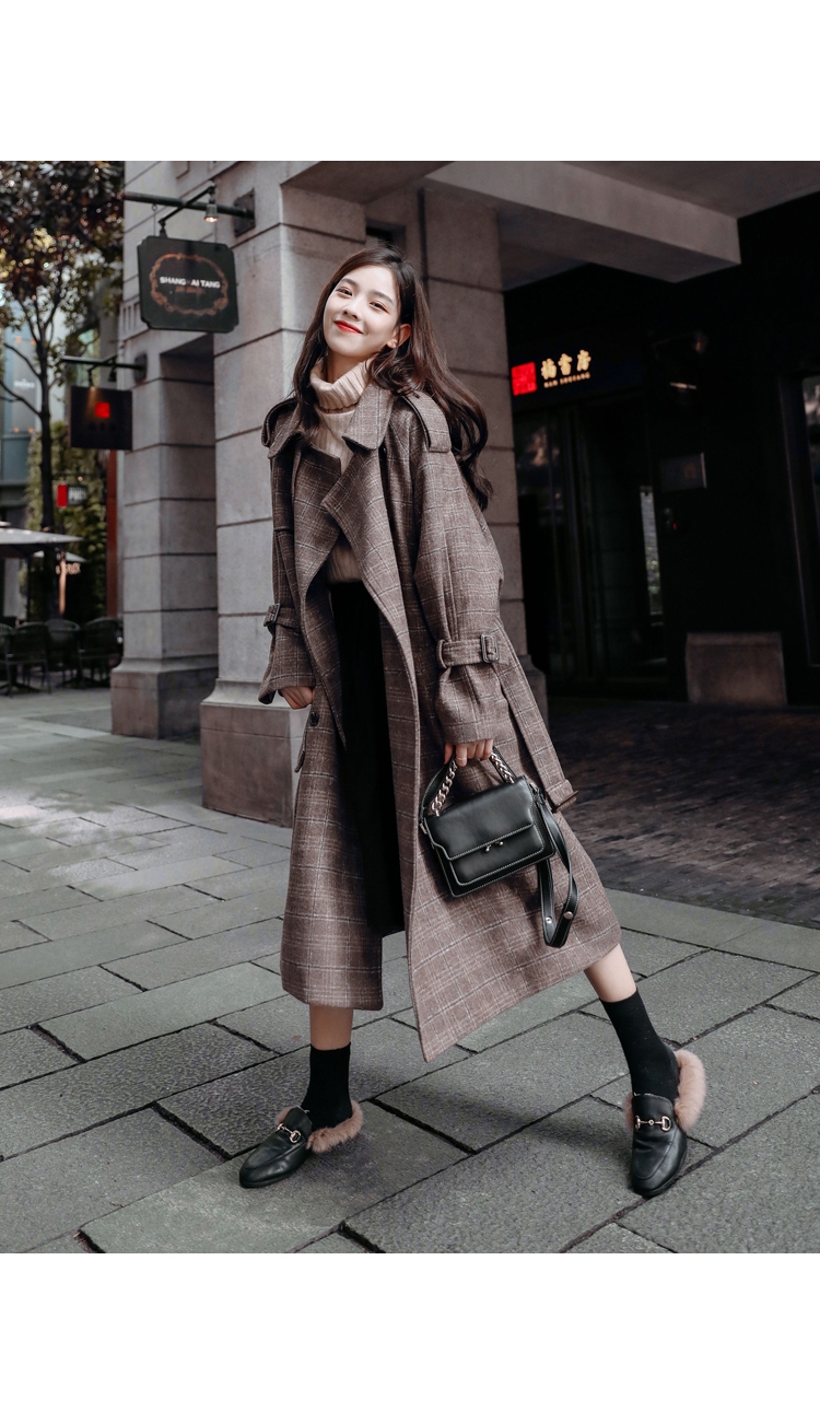 商品名稱:秋冬新款毛呢大衣女千鳥格寬松顯瘦中長款過膝格子呢子外套