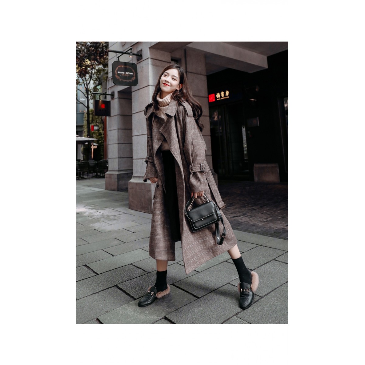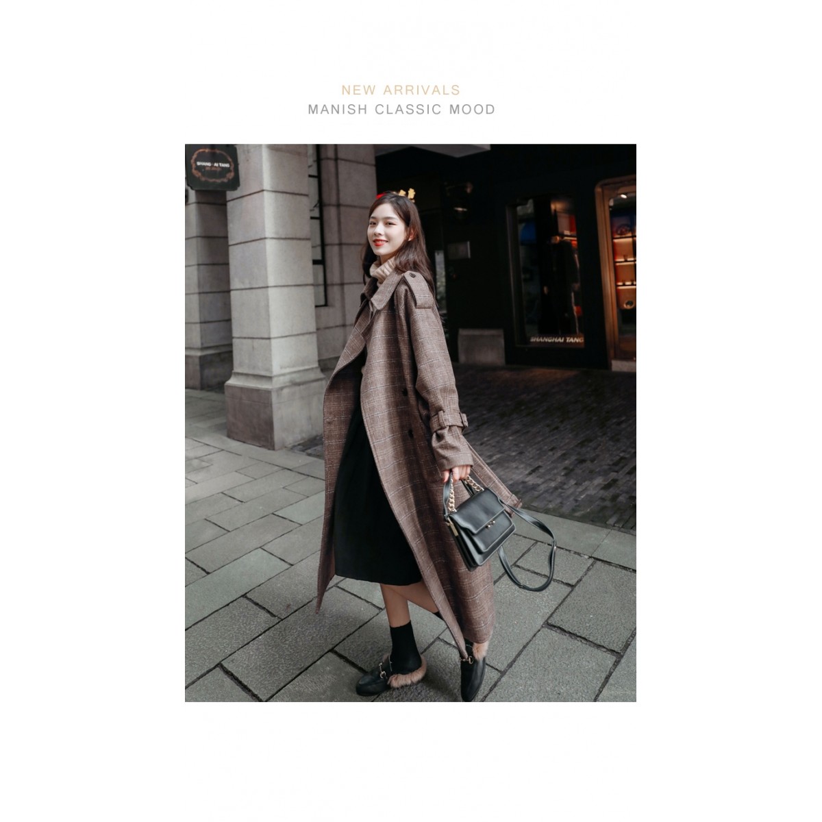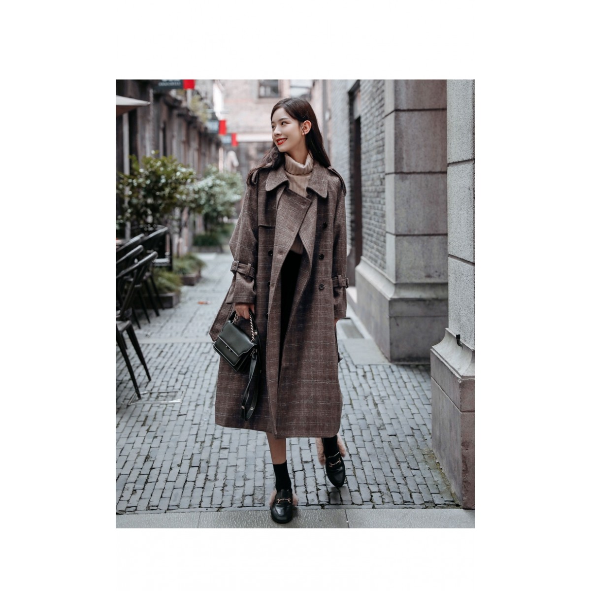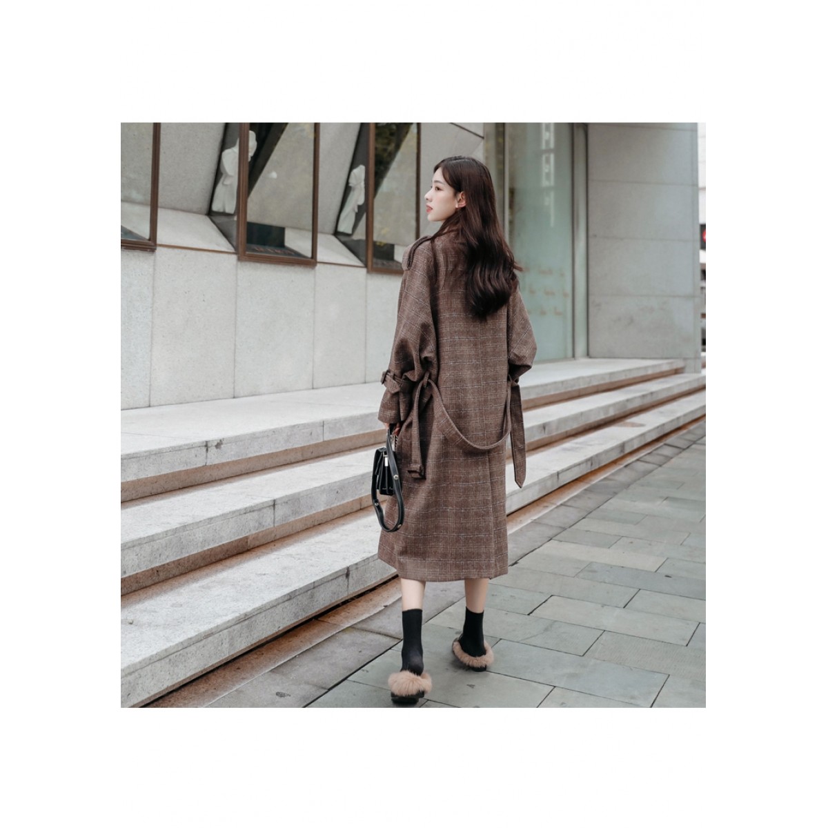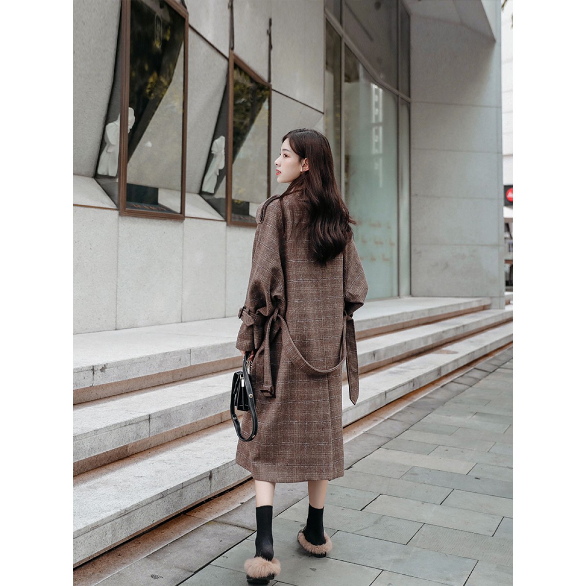 商品名稱:秋冬新款毛呢大衣女千鳥格寬松顯瘦中長款過膝格子呢子外套