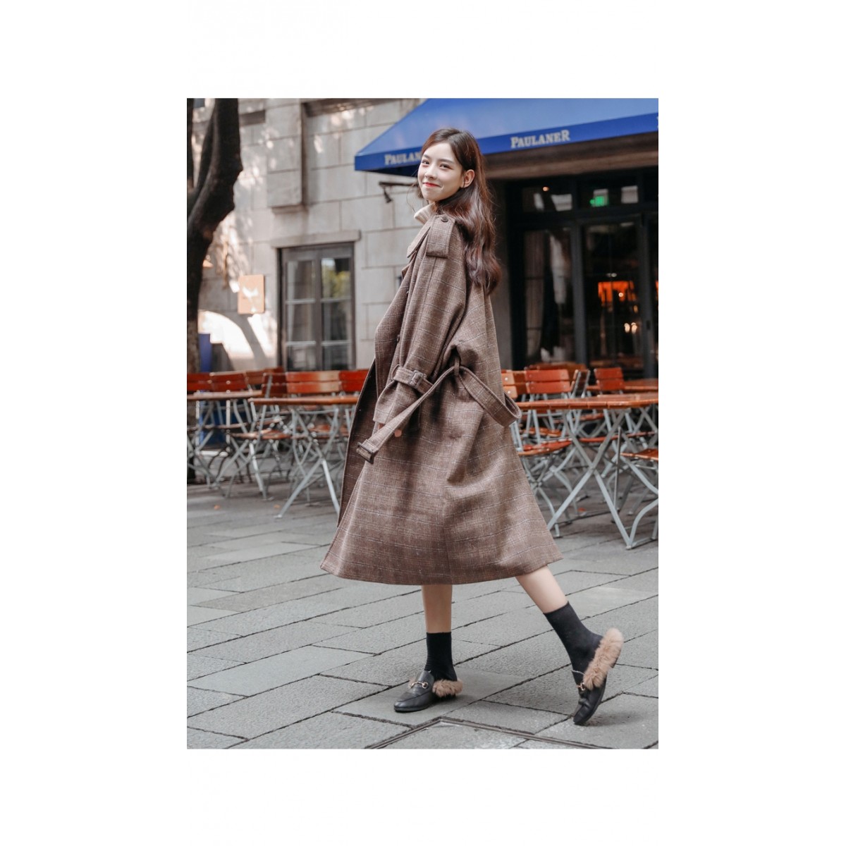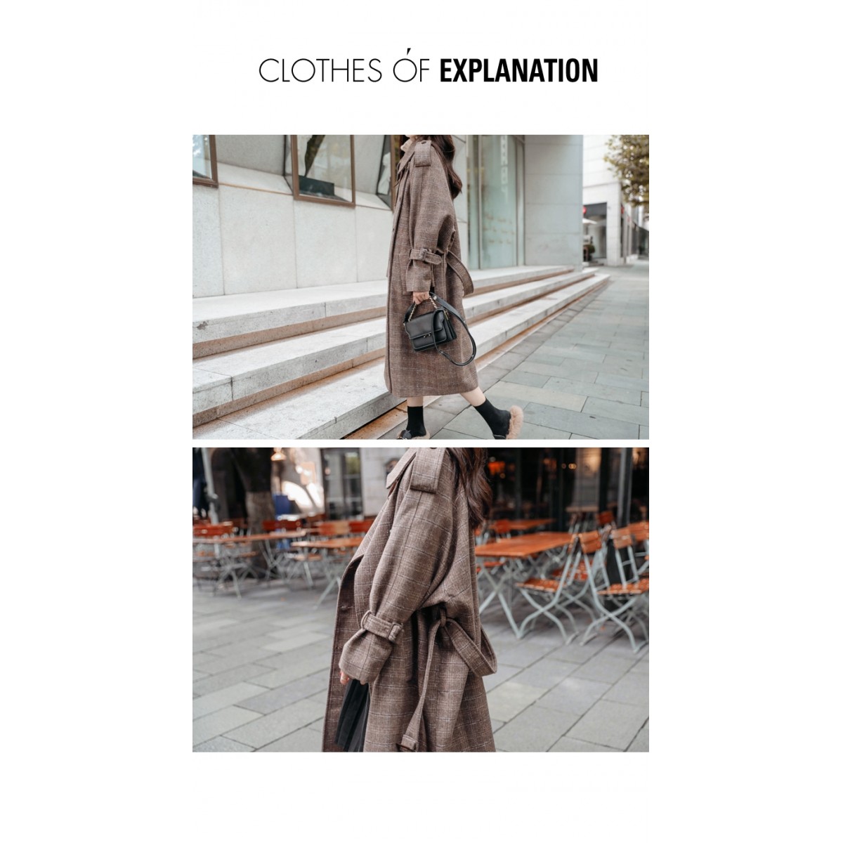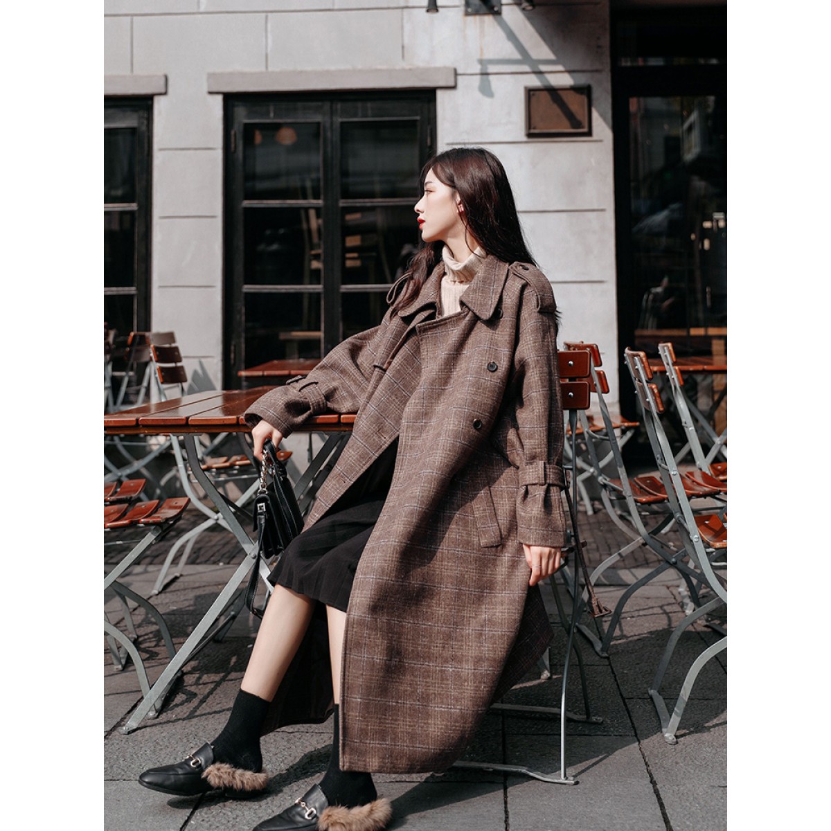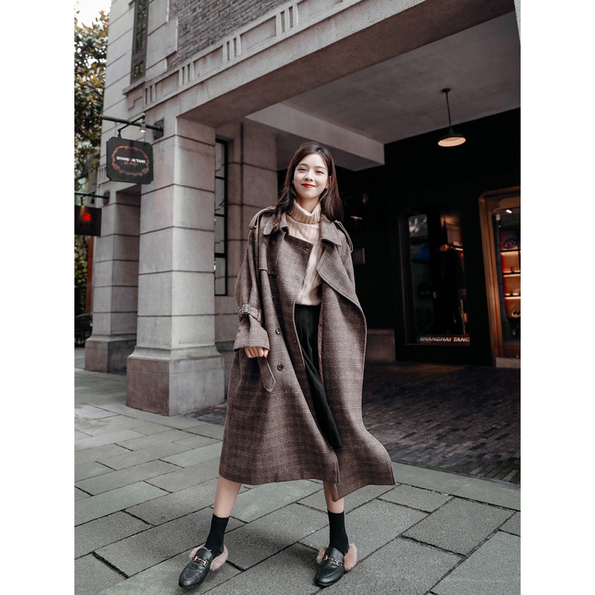 商品名稱:秋冬新款毛呢大衣女千鳥格寬松顯瘦中長款過膝格子呢子外套