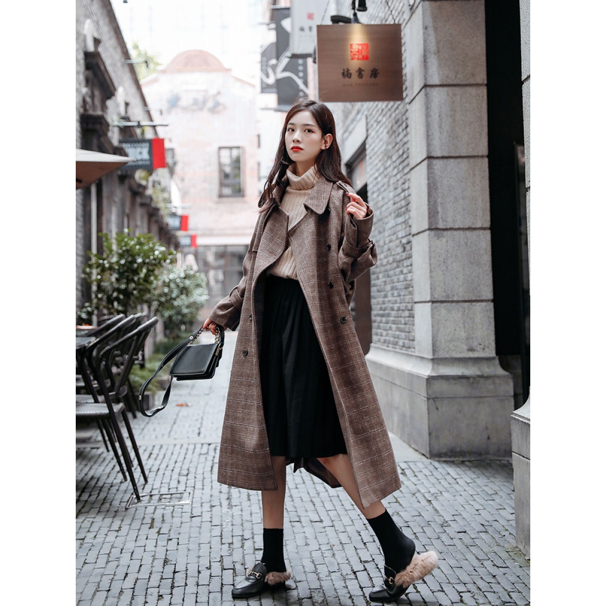 秋冬新款毛呢大衣女千鳥格寬松顯瘦中長款過膝格子呢子外套