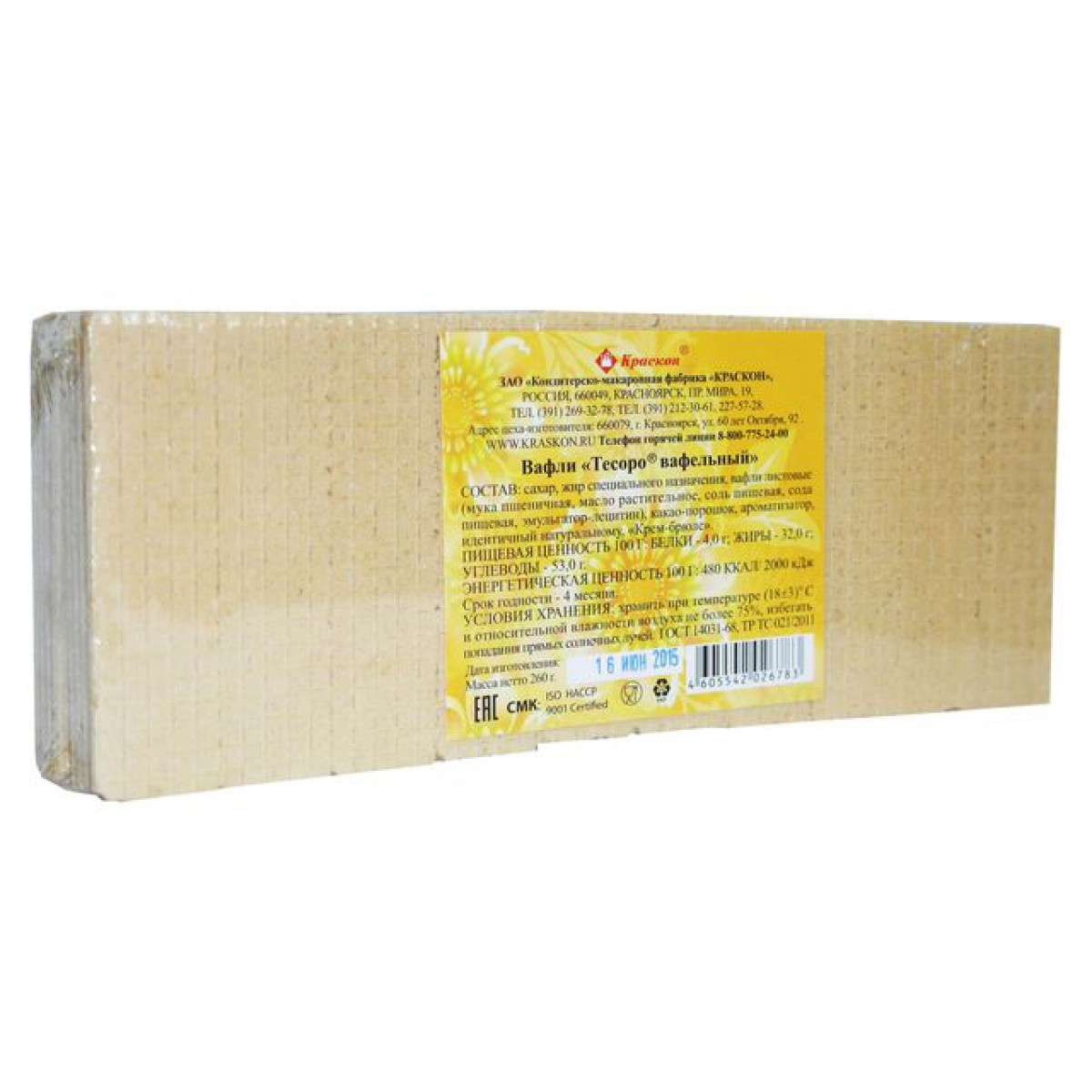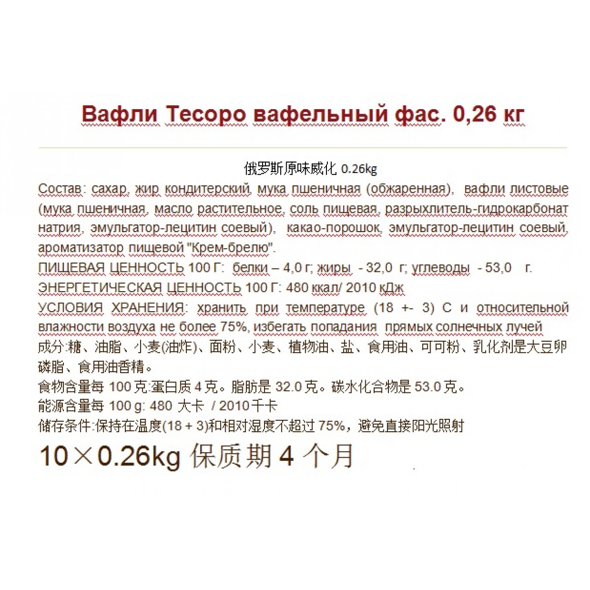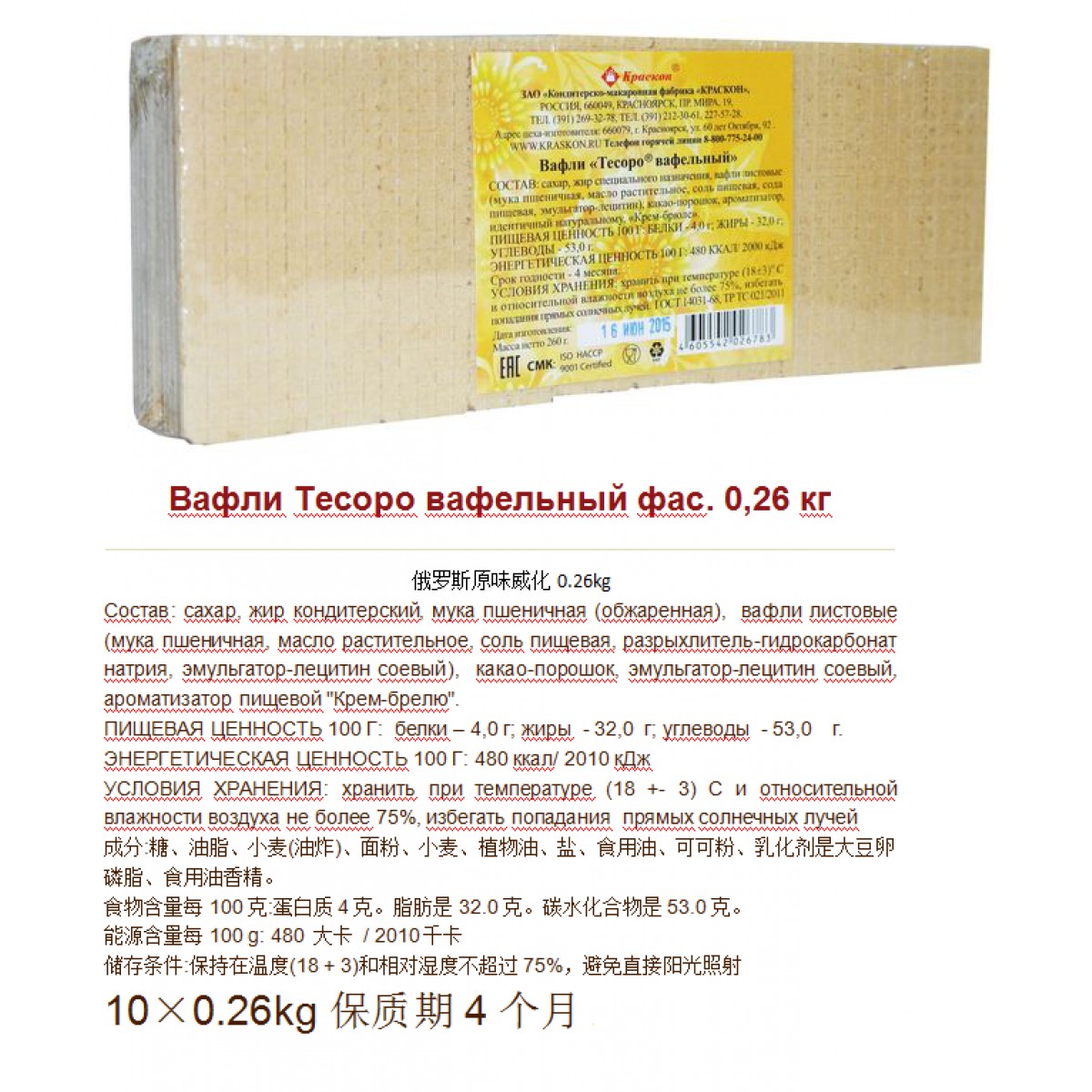 Состав: сахар, жир кондитерский, мука пшеничная (обжаренная), вафли листовые (мука пшеничная, масло растительное, соль пищевая, разрыхлитель-гидрокарбонат натрия, эмульгатор-лецитин соевый), какао-порошок, эмульгатор-лецитин соевый, ароматизатор пищевой "Крем-брелю".
