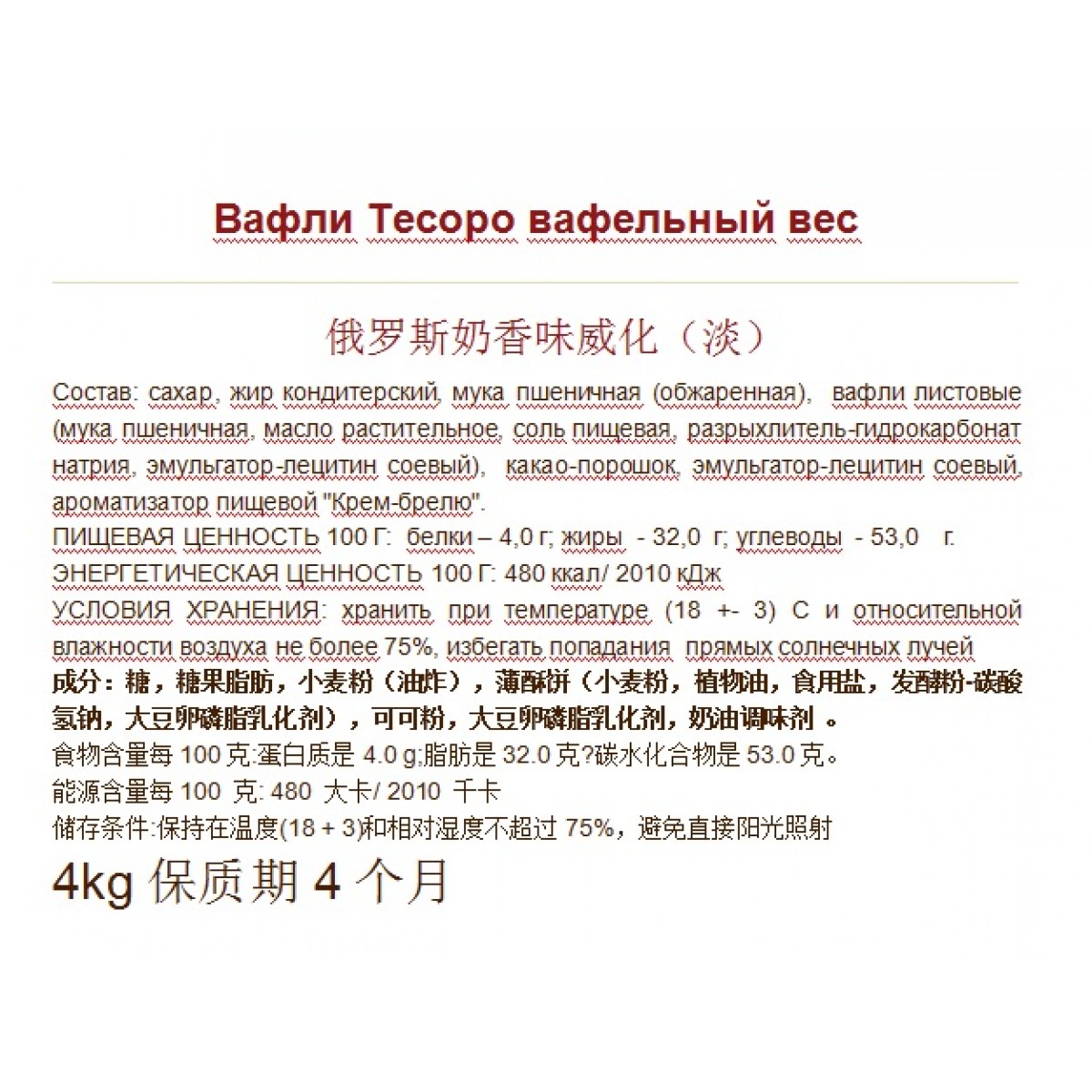 Состав: сахар, жир кондитерский, мука пшеничная (обжаренная), вафли листовые (мука пшеничная, масло растительное, соль пищевая, разрыхлитель-гидрокарбонат натрия, эмульгатор-лецитин соевый), какао-порошок, эмульгатор-лецитин соевый, ароматизатор пищевой "Крем-брелю".