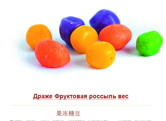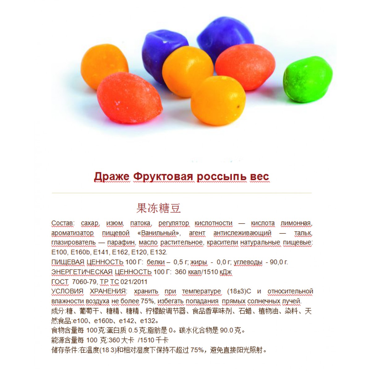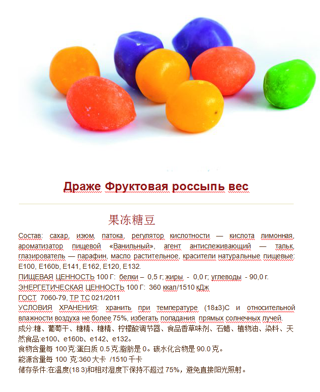 Состав: сахар, изюм, патока, регулятор кислотности — кислота лимонная, ароматизатор пищевой ?Ванильный?, агент антислеживающий — тальк, глазирователь — парафин, масло растительное, красители натуральные пищевые: Е100, Е160b, Е141, Е162, Е120, Е132.