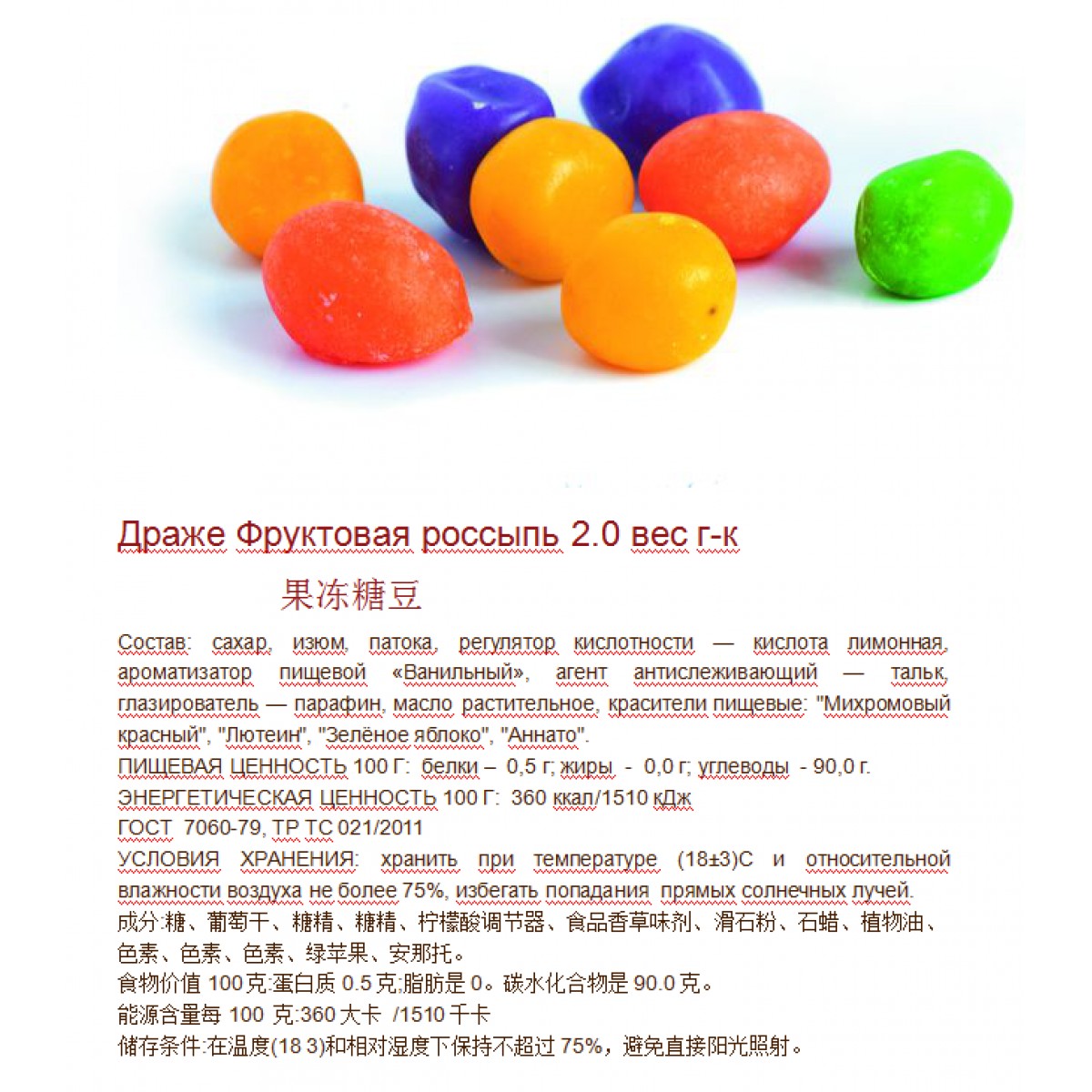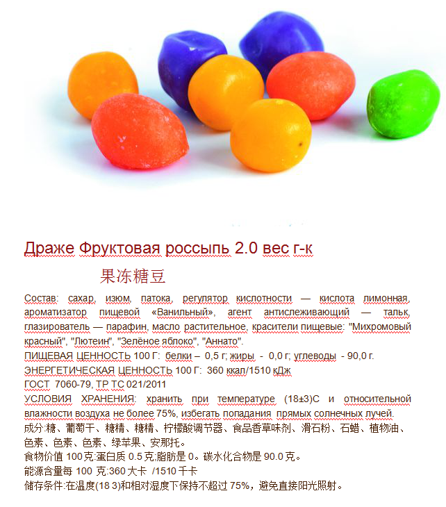 Состав: сахар, изюм, патока, регулятор кислотности — кислота лимонная, ароматизатор пищевой ?Ванильный?, агент антислеживающий — тальк, глазирователь — парафин, масло растительное, красители пищевые: "Михромовый красный", "Лютеин", "Зелёное яблоко", "Аннато".