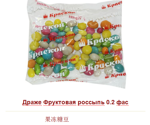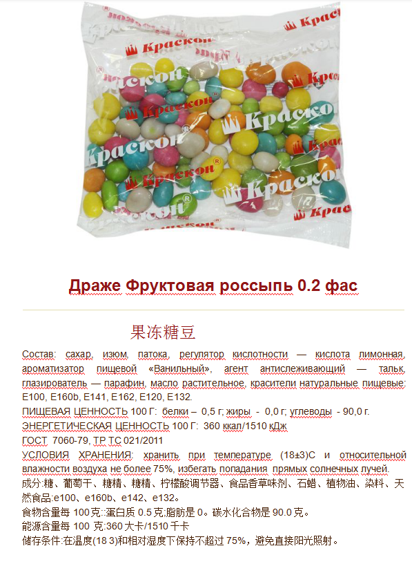Состав: сахар, изюм, патока, регулятор кислотности — кислота лимонная, ароматизатор пищевой ?Ванильный?, агент антислеживающий — тальк, глазирователь — парафин, масло растительное, красители натуральные пищевые: Е100, Е160b, Е141, Е162, Е120, Е132.