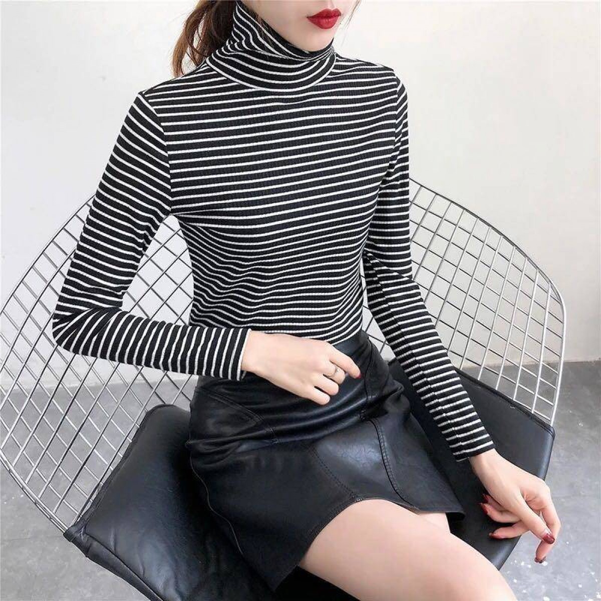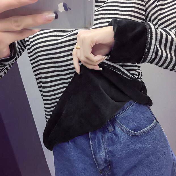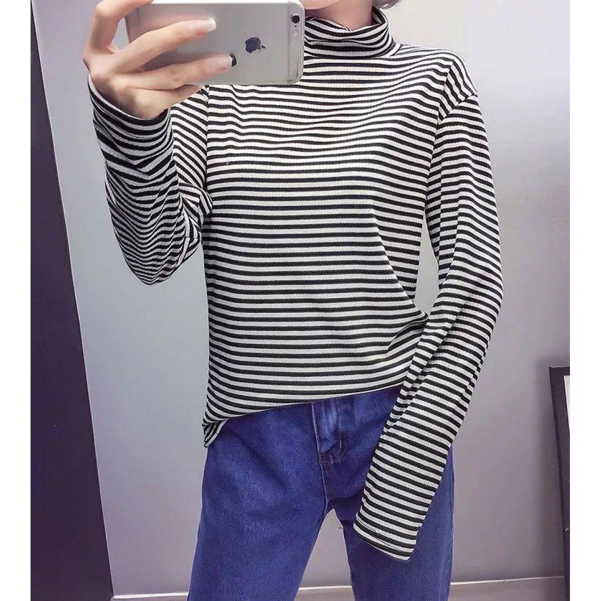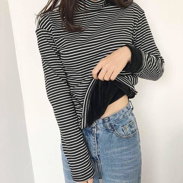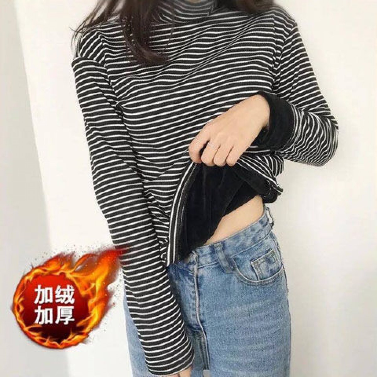 商品名稱:女2019冬季加絨加厚條紋打底衫百搭長袖高領黑白條紋保暖上衣潮女