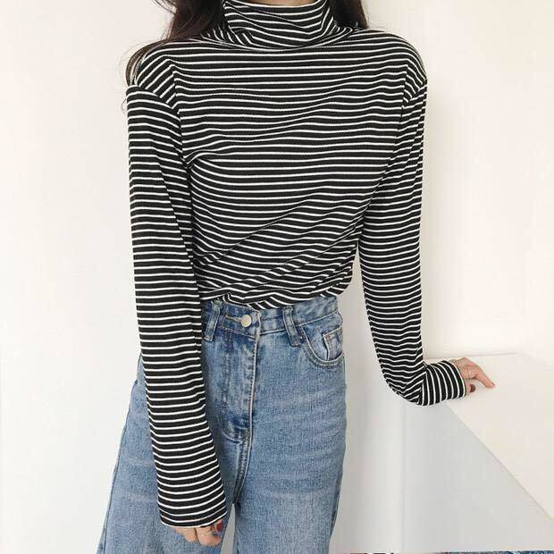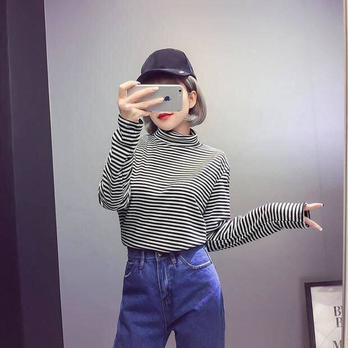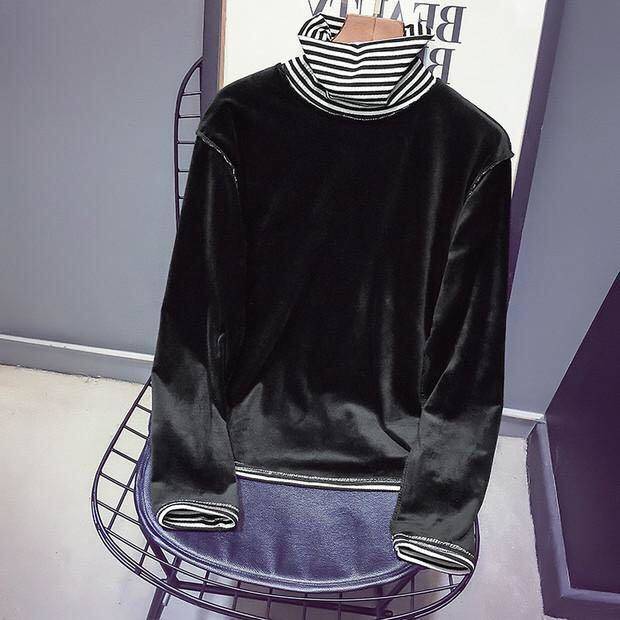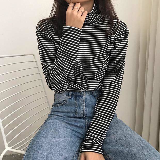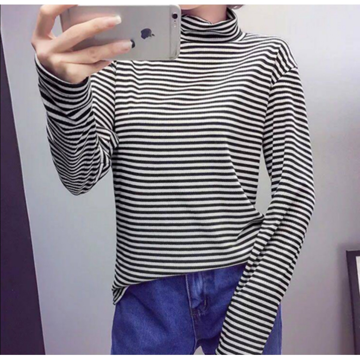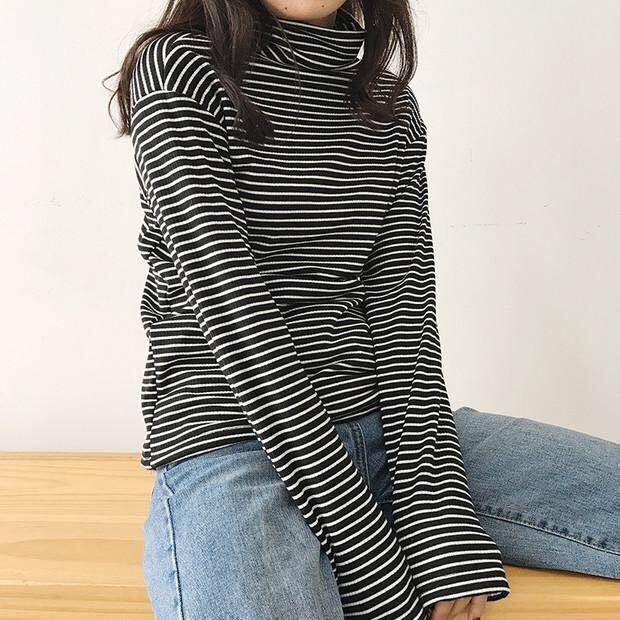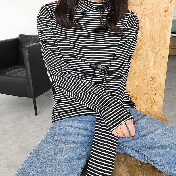 商品名稱:女2019冬季加絨加厚條紋打底衫百搭長袖高領黑白條紋保暖上衣潮女