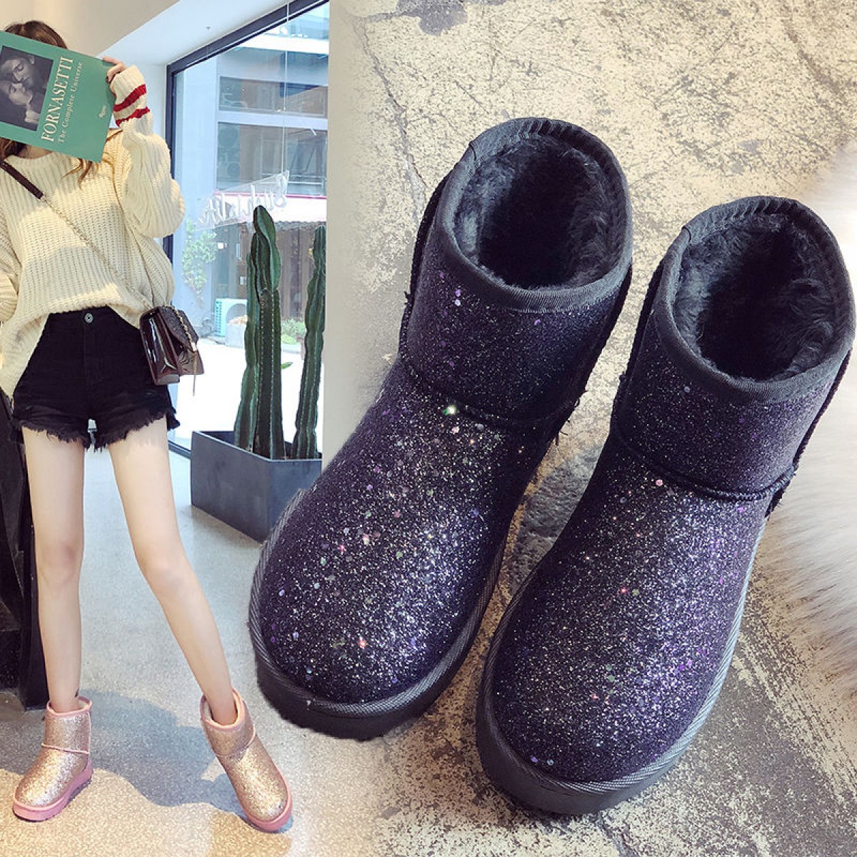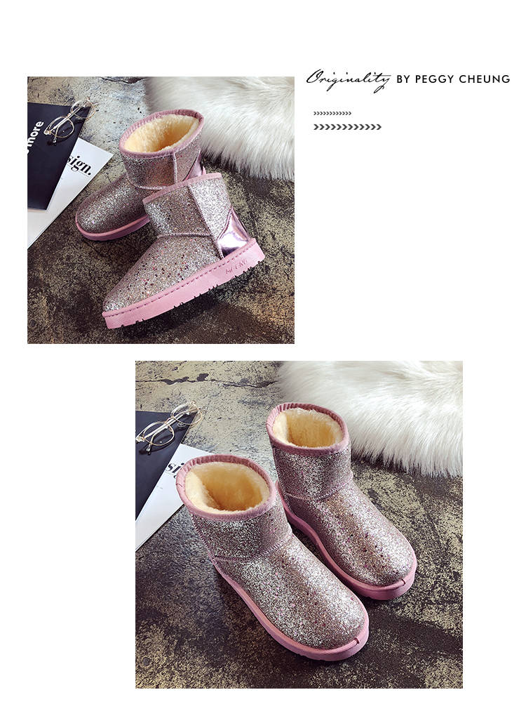 冬季潮亮片短靴平底學(xué)生雪地靴加厚短筒棉鞋加絨防水防滑面包女鞋