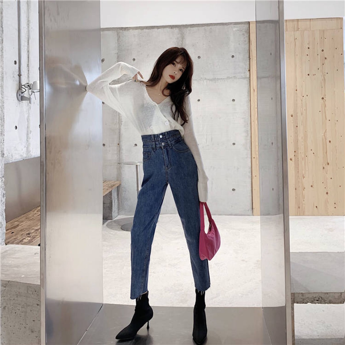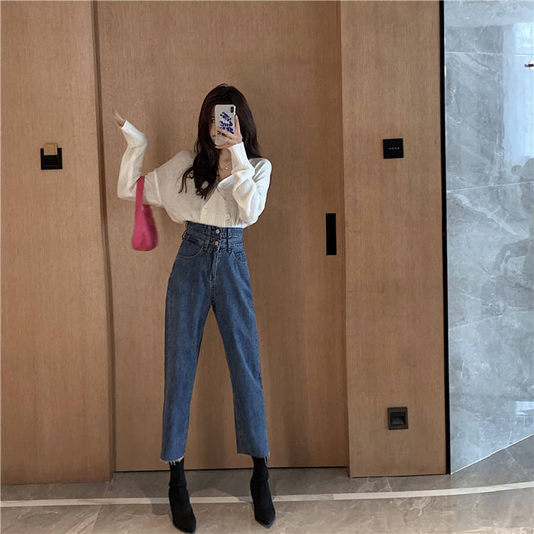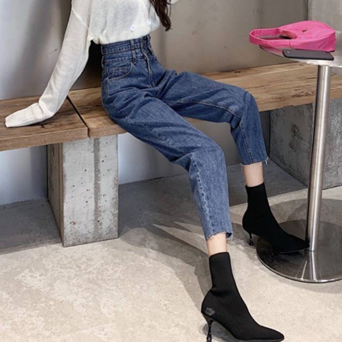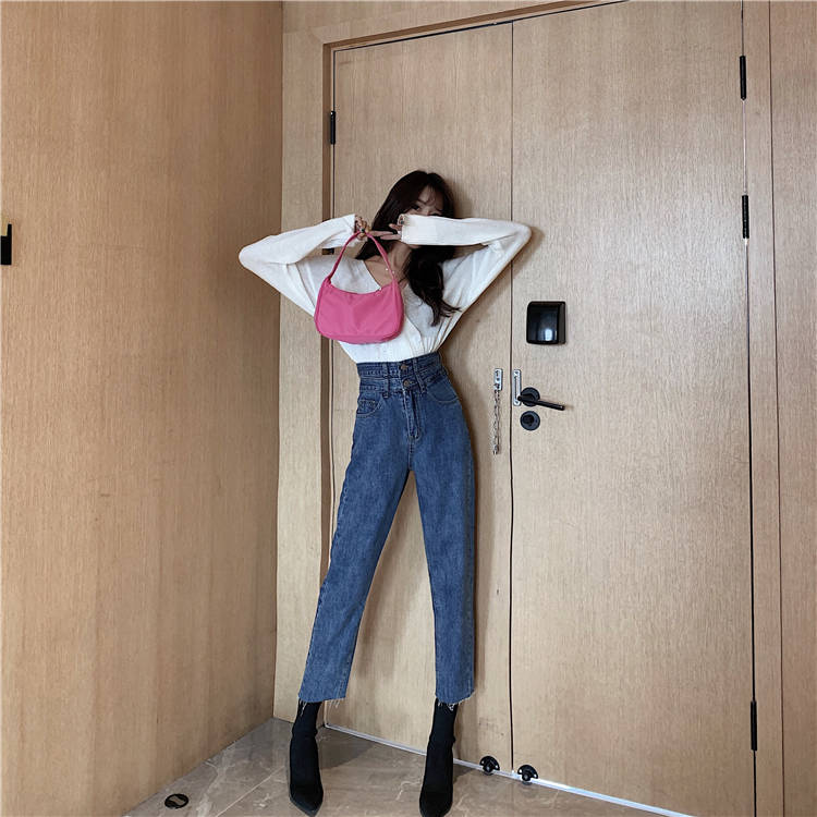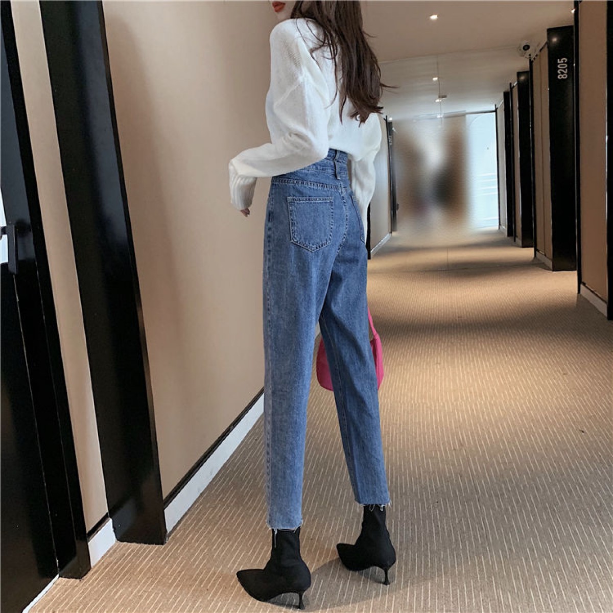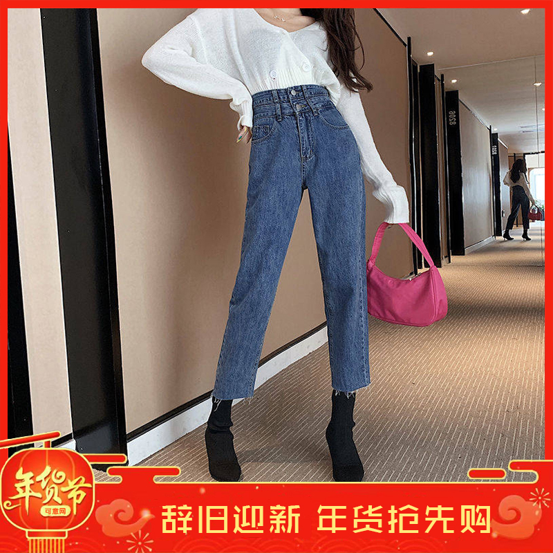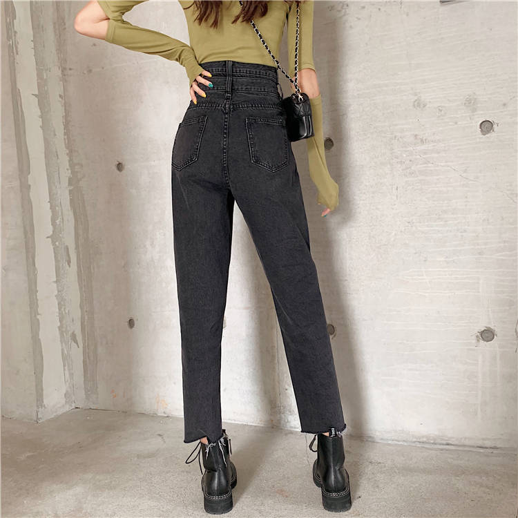 商品名稱:秋裝韓版2019新款百搭顯瘦學(xué)生直筒褲女高腰顯瘦網(wǎng)紅毛邊牛仔褲潮