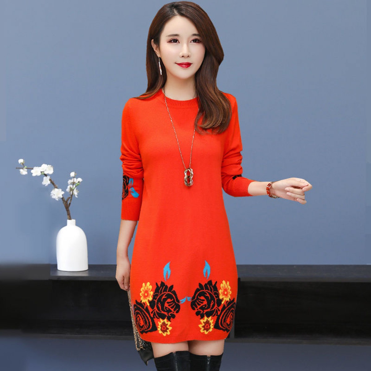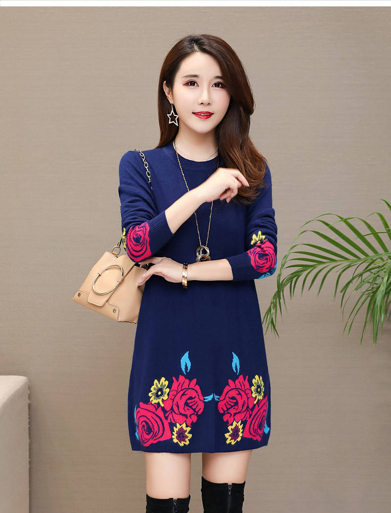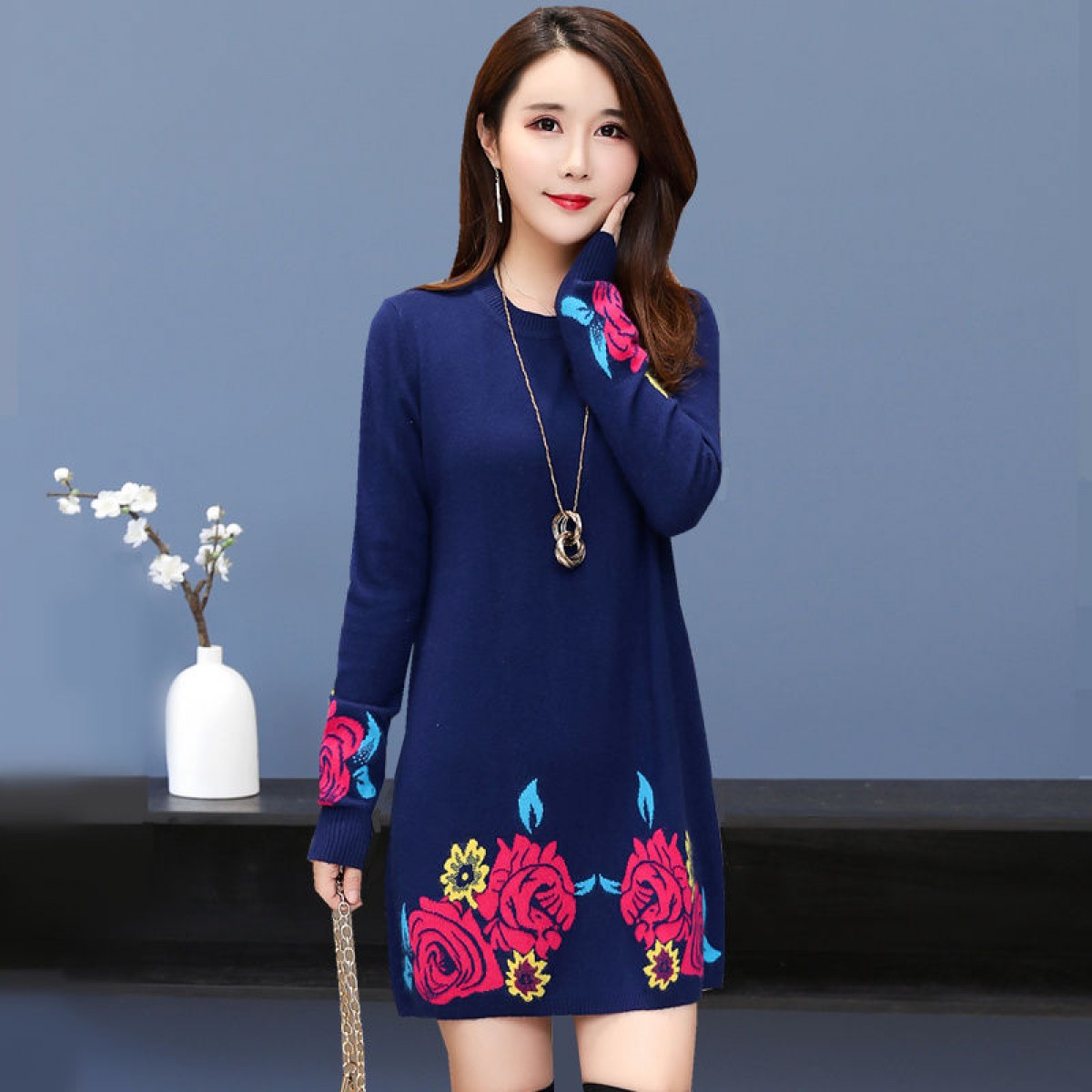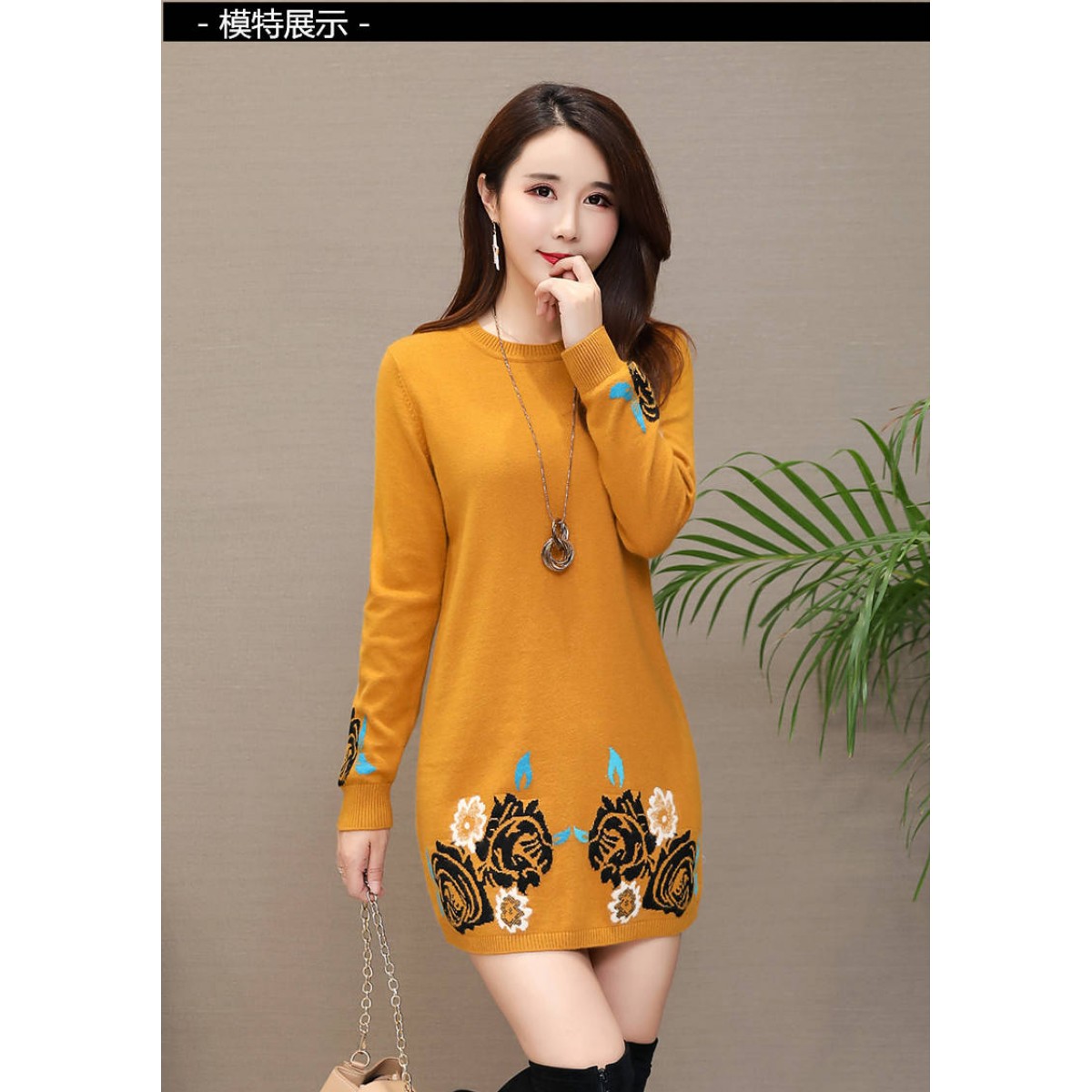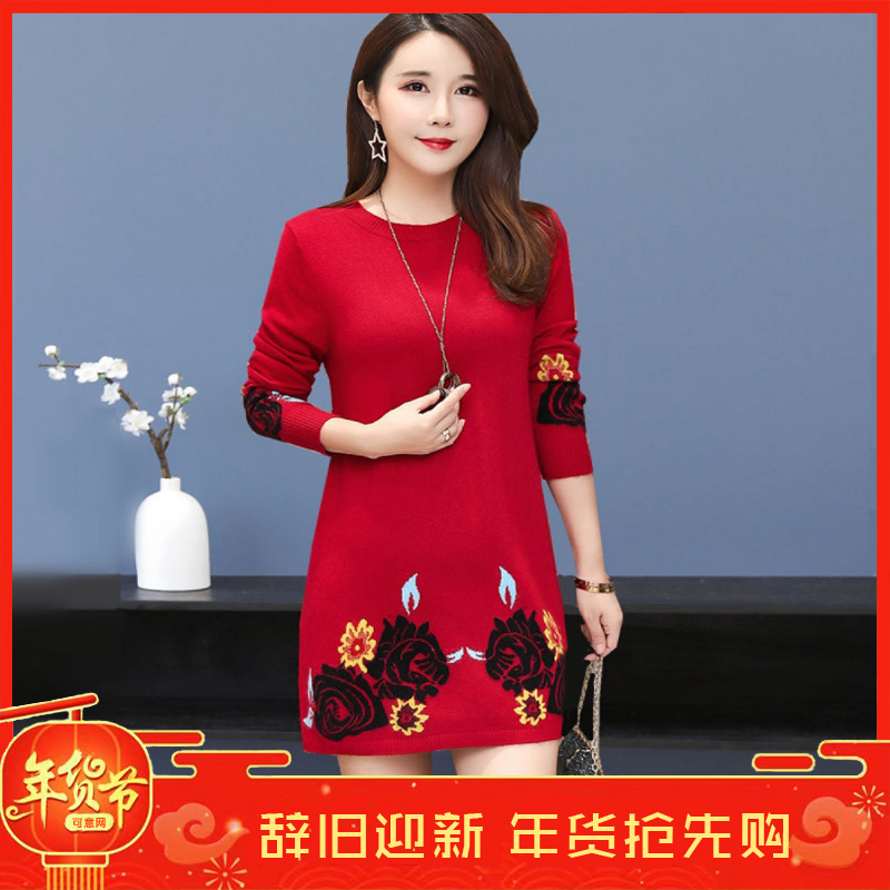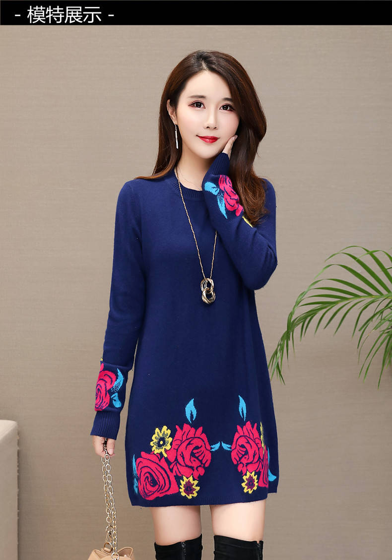 商品名稱:秋冬圓領(lǐng)媽媽寬松毛衣女中長款印花連衣裙大碼中老年針織厚打底衫