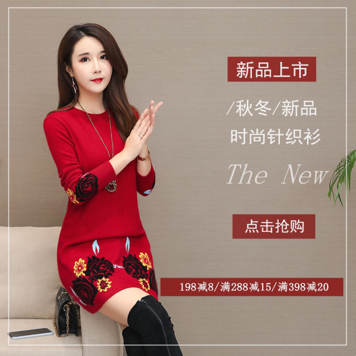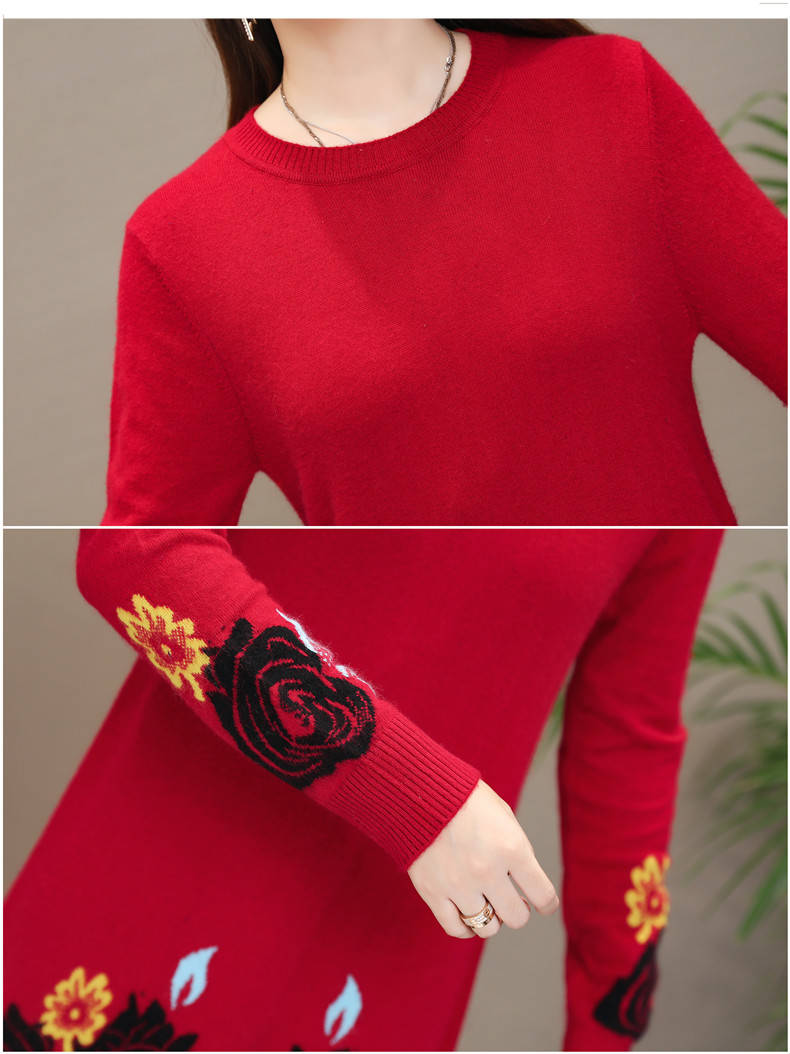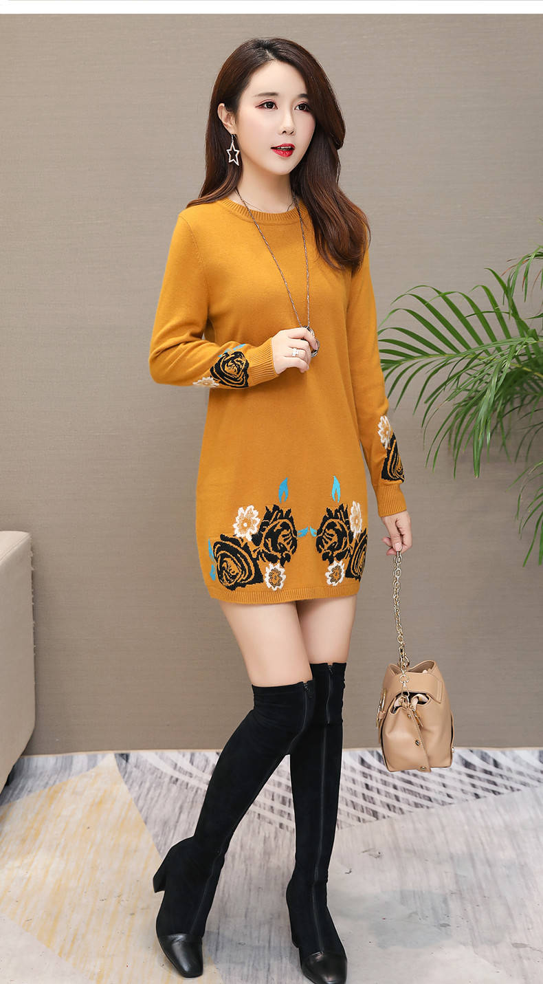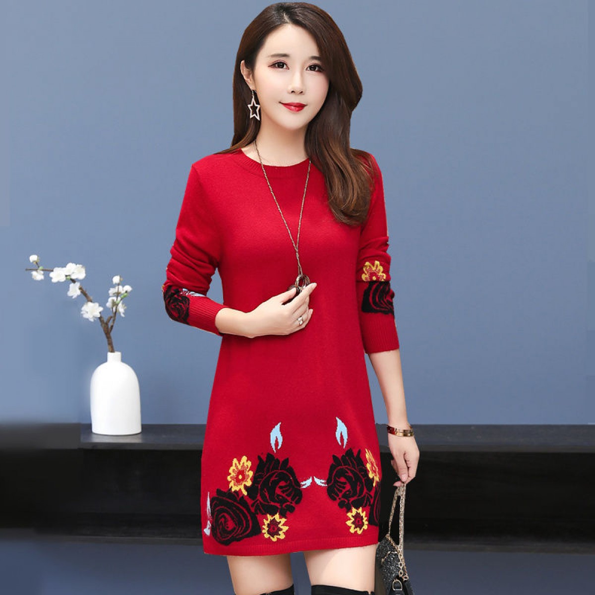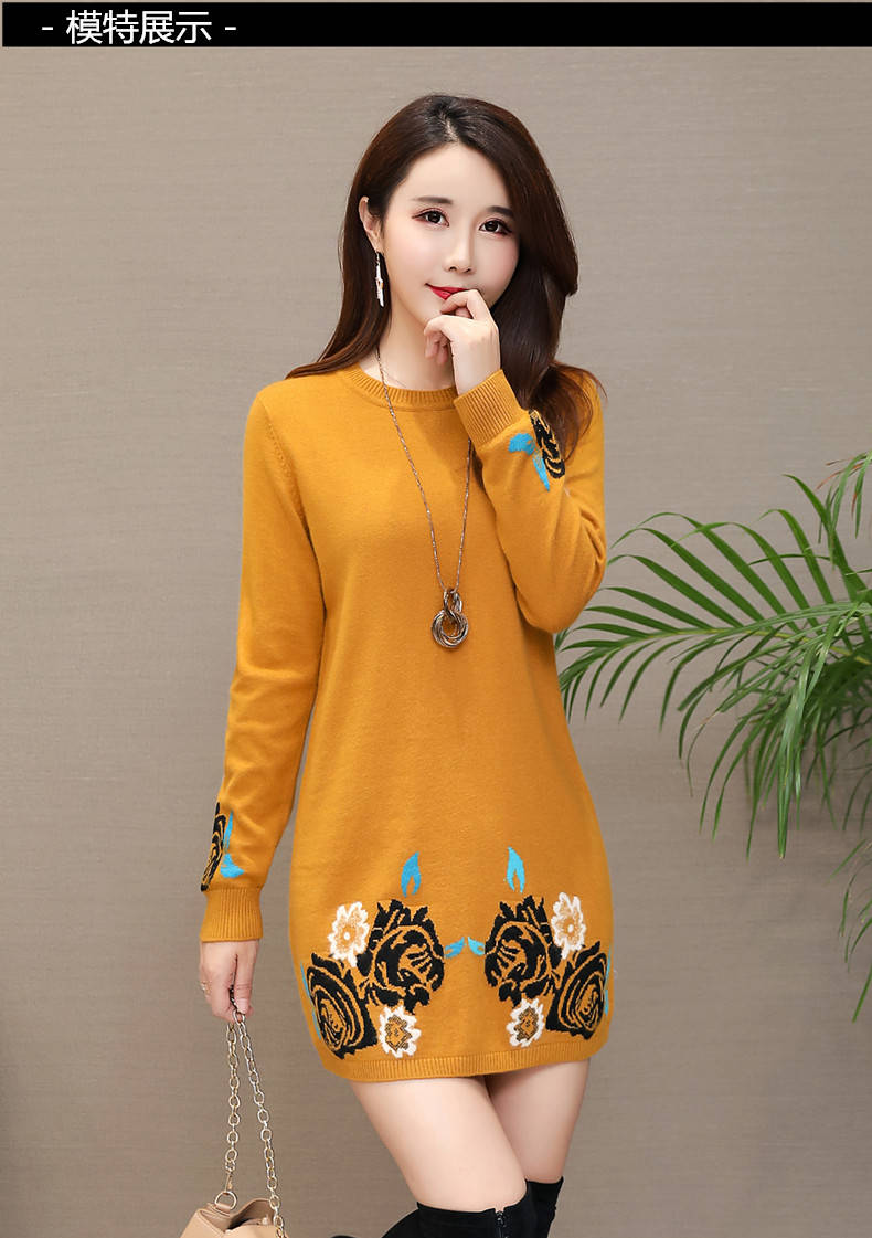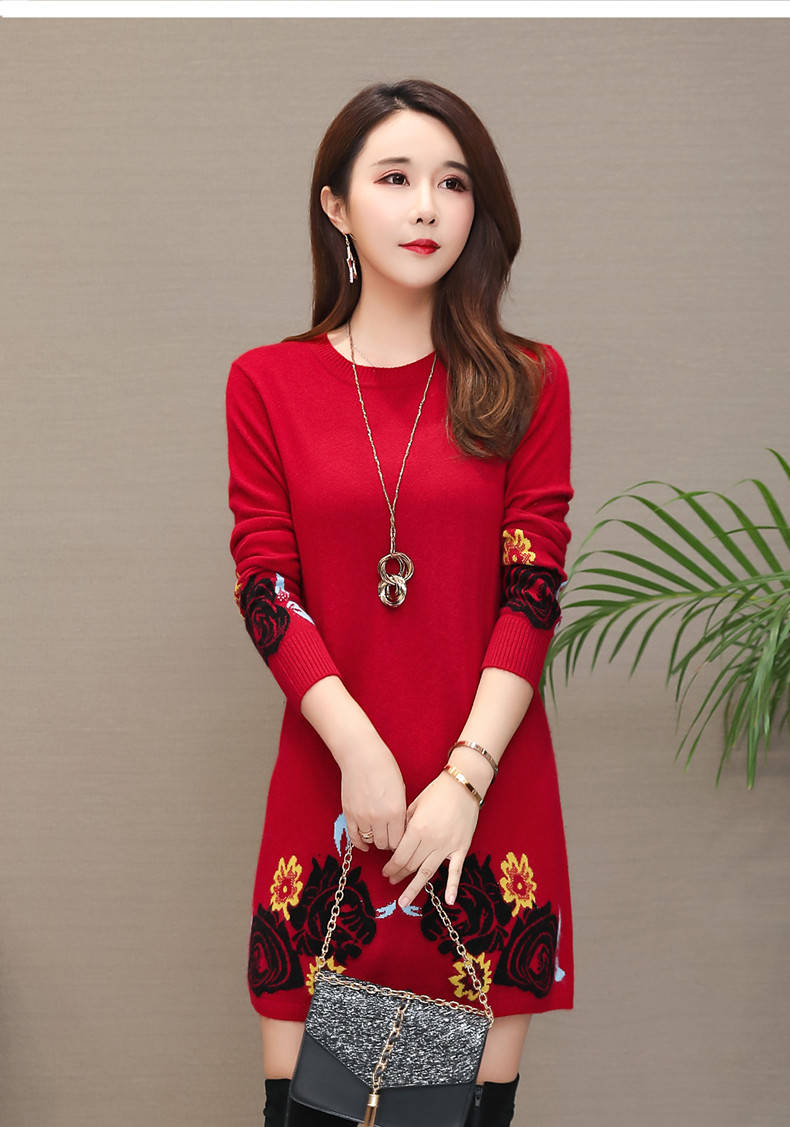 商品名稱:秋冬圓領(lǐng)媽媽寬松毛衣女中長款印花連衣裙大碼中老年針織厚打底衫