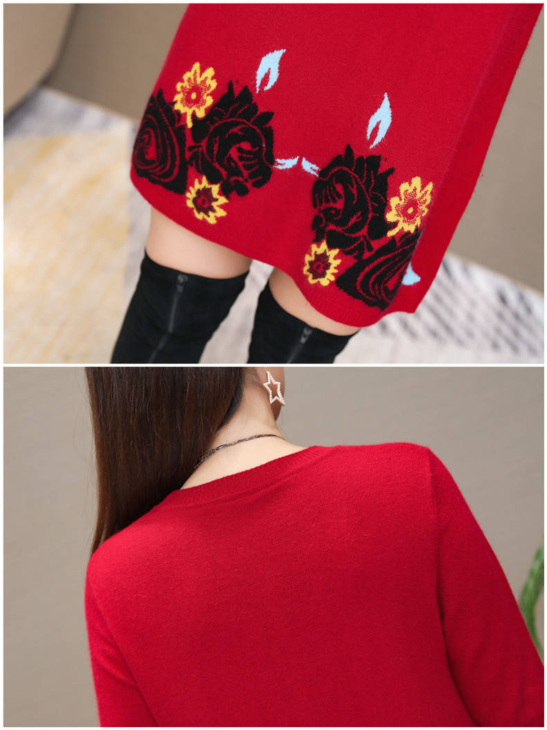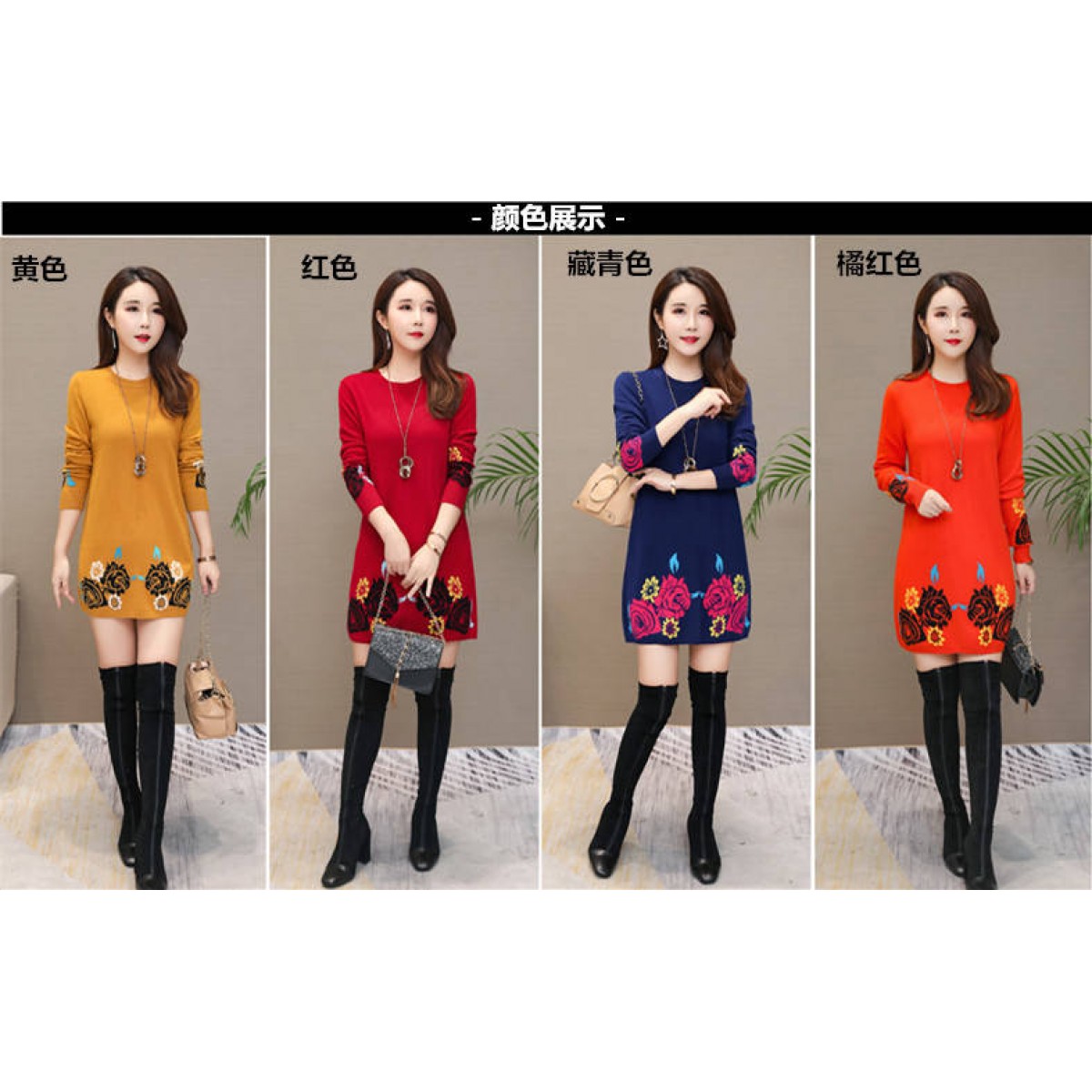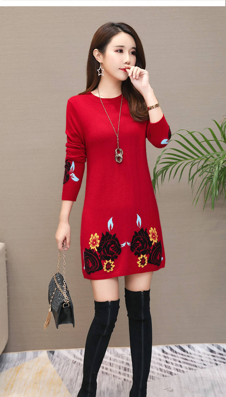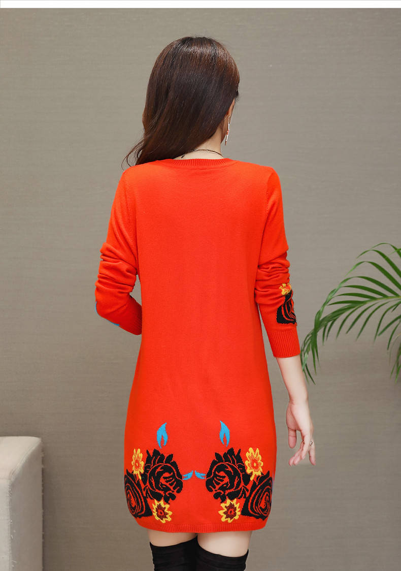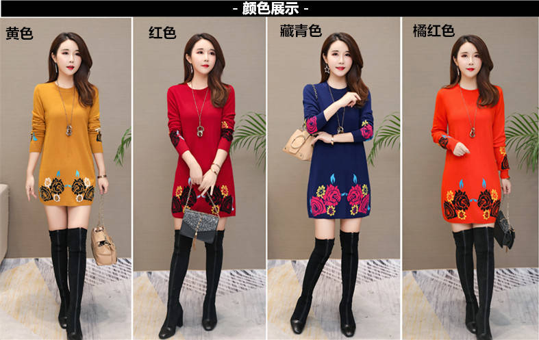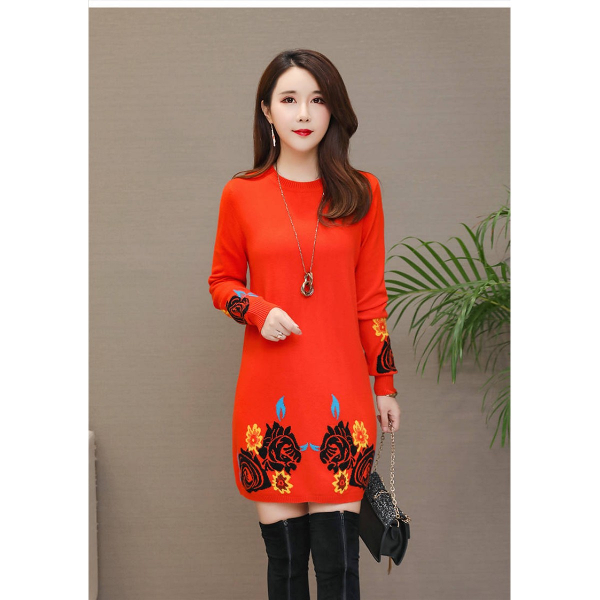 商品名稱:秋冬圓領(lǐng)媽媽寬松毛衣女中長款印花連衣裙大碼中老年針織厚打底衫