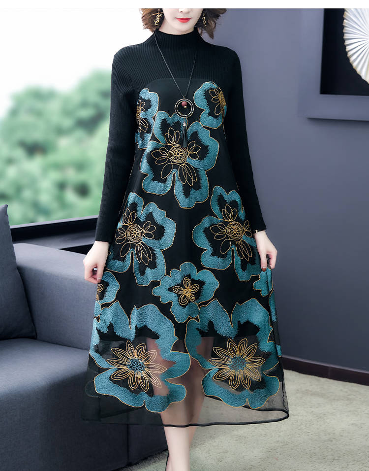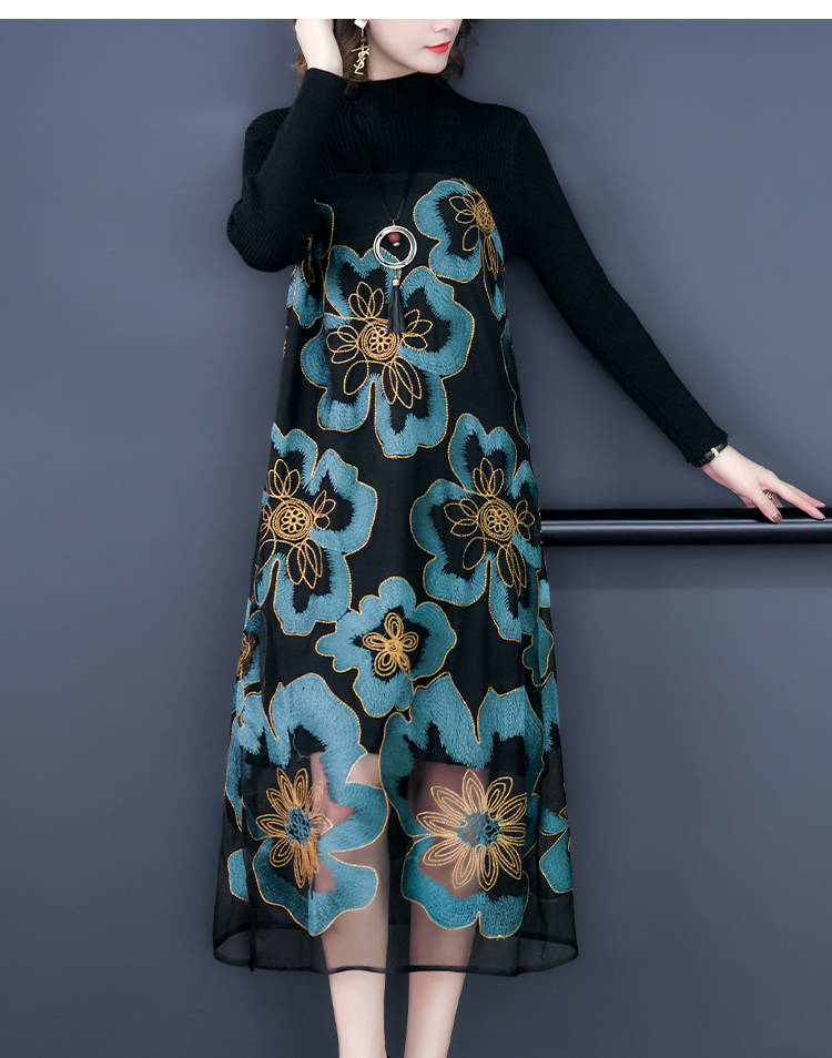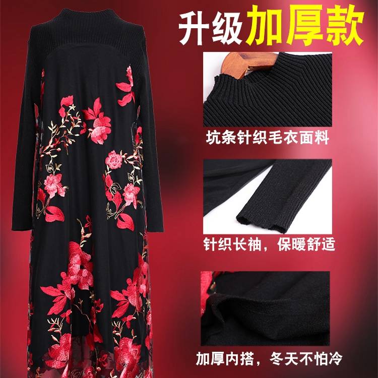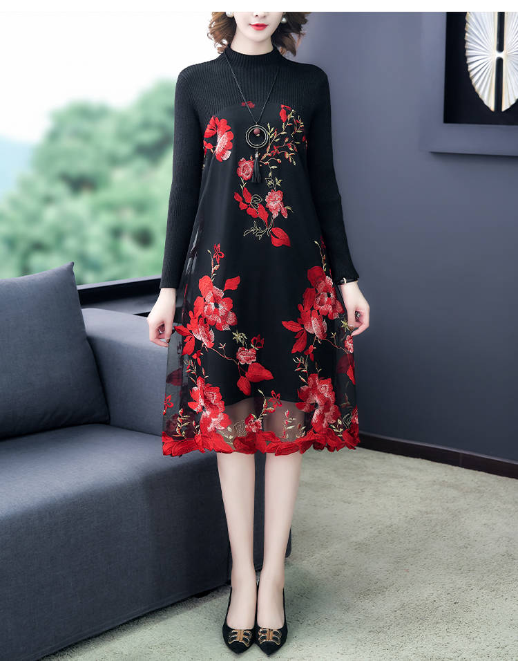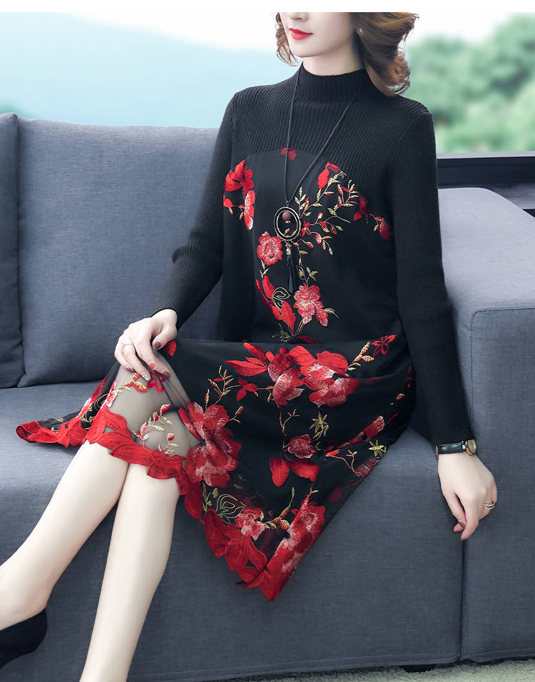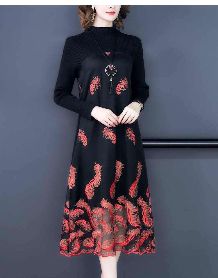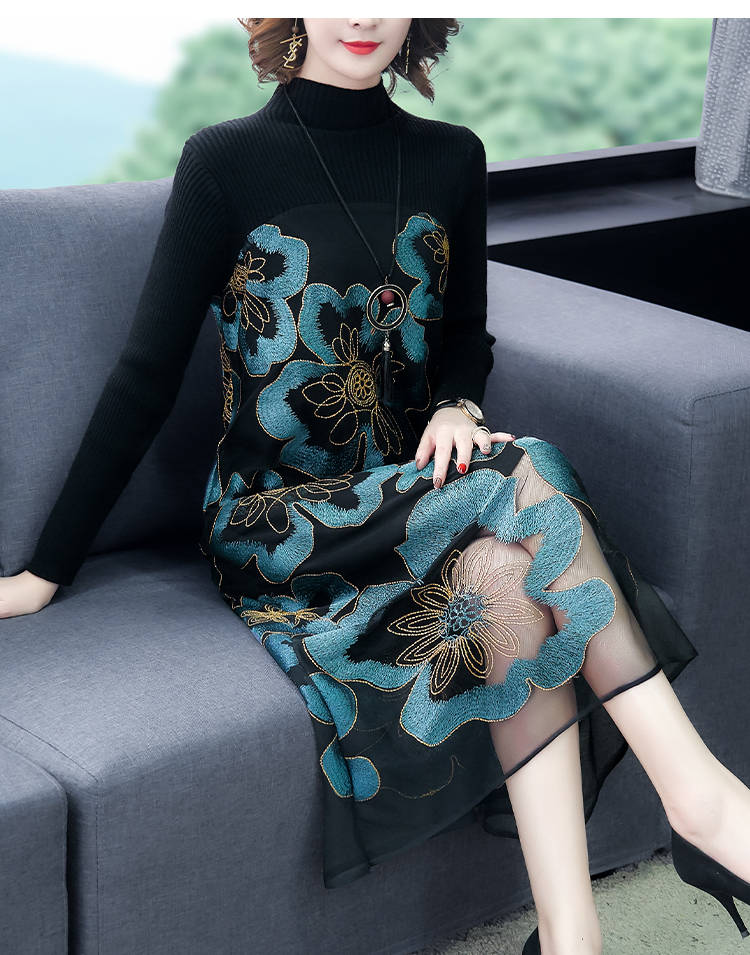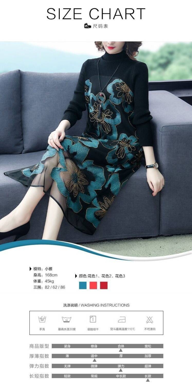 商品名稱:秋冬新款大碼女裝遮肚連衣裙長袖毛衣拼接網(wǎng)紗繡花連衣裙針織女裝