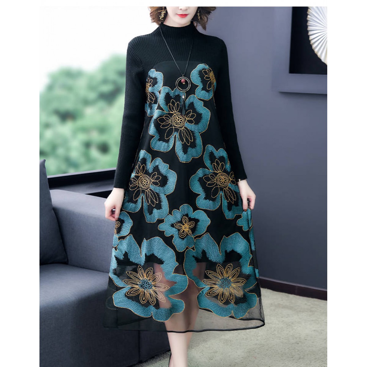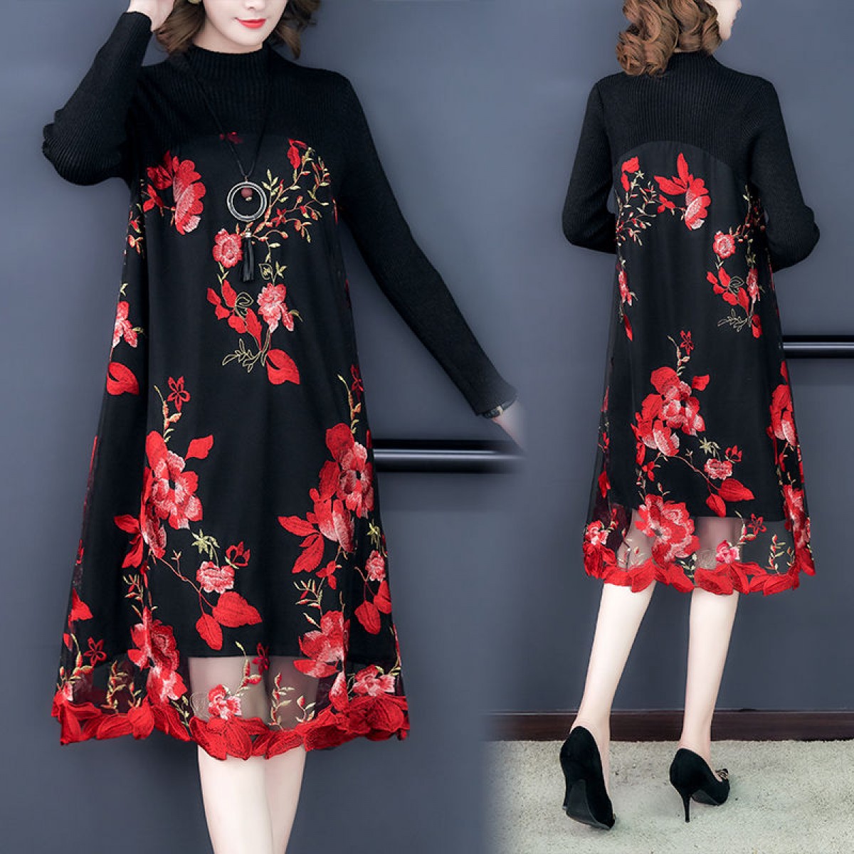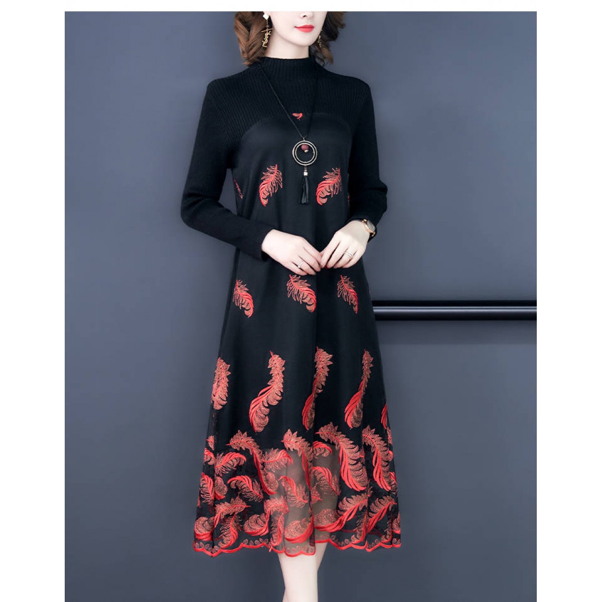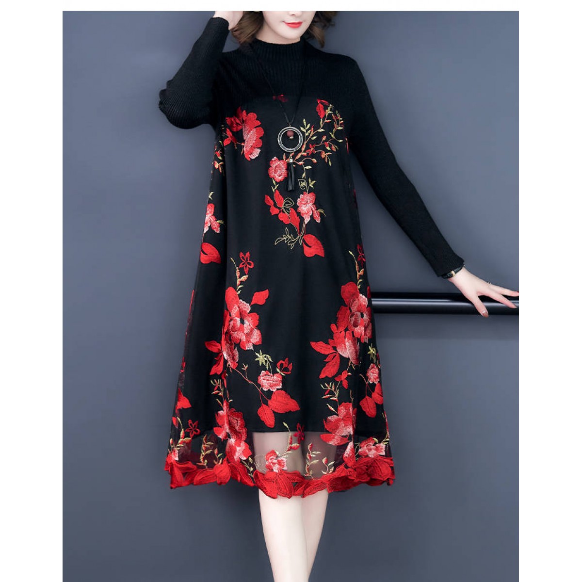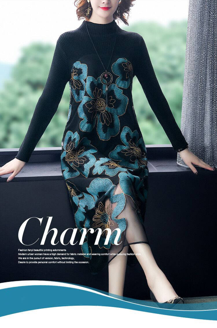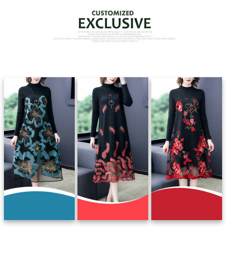 商品名稱:秋冬新款大碼女裝遮肚連衣裙長袖毛衣拼接網(wǎng)紗繡花連衣裙針織女裝