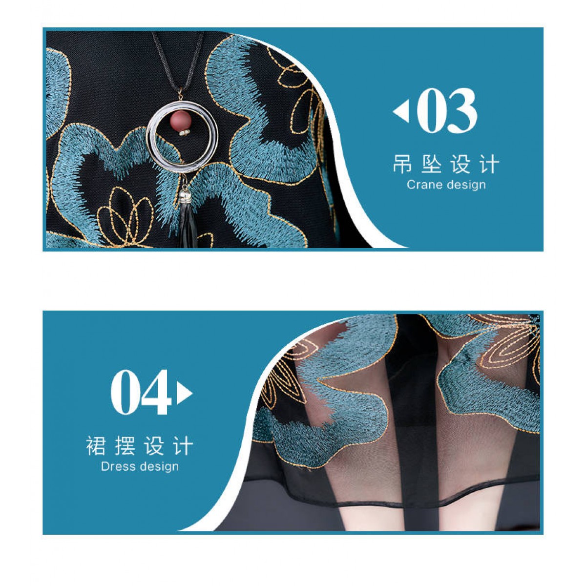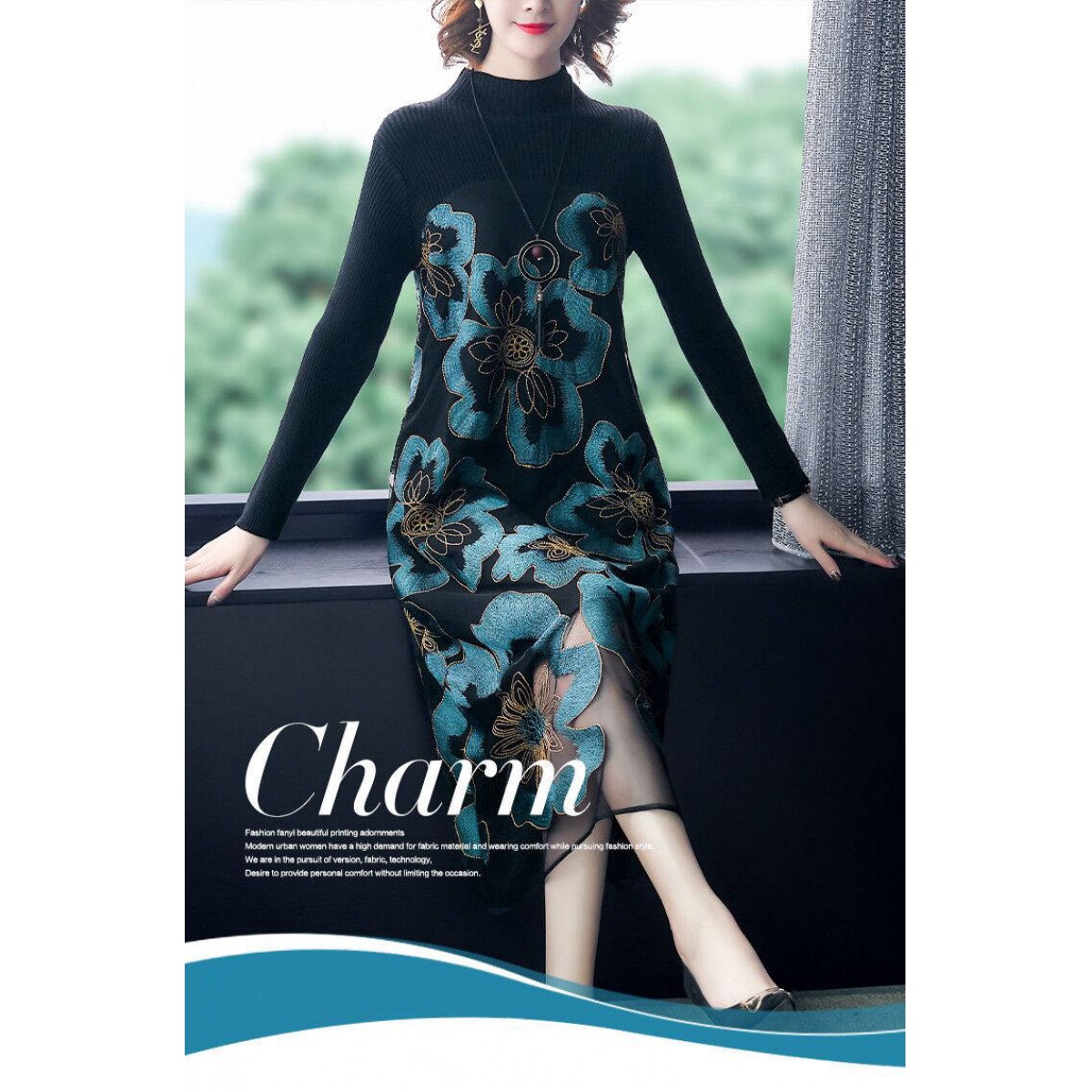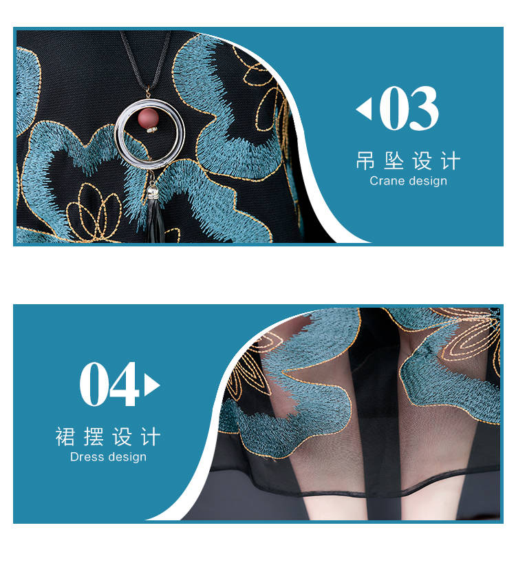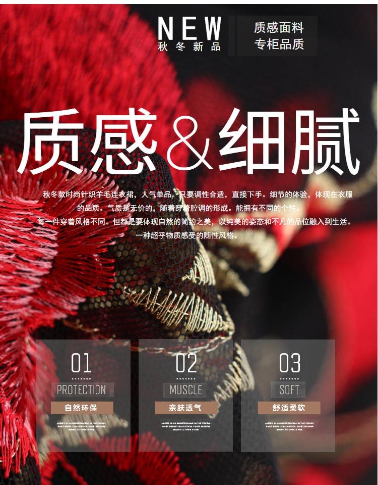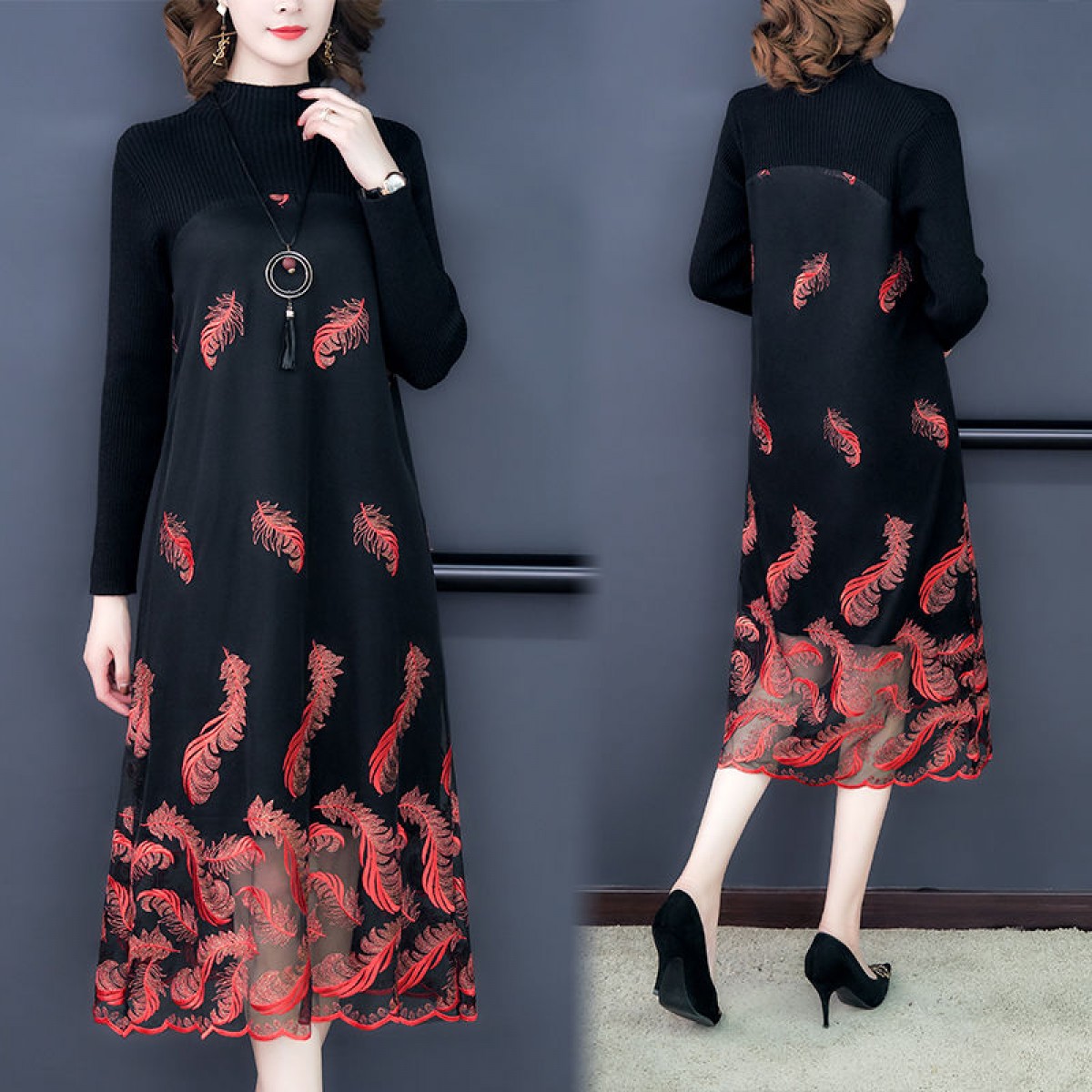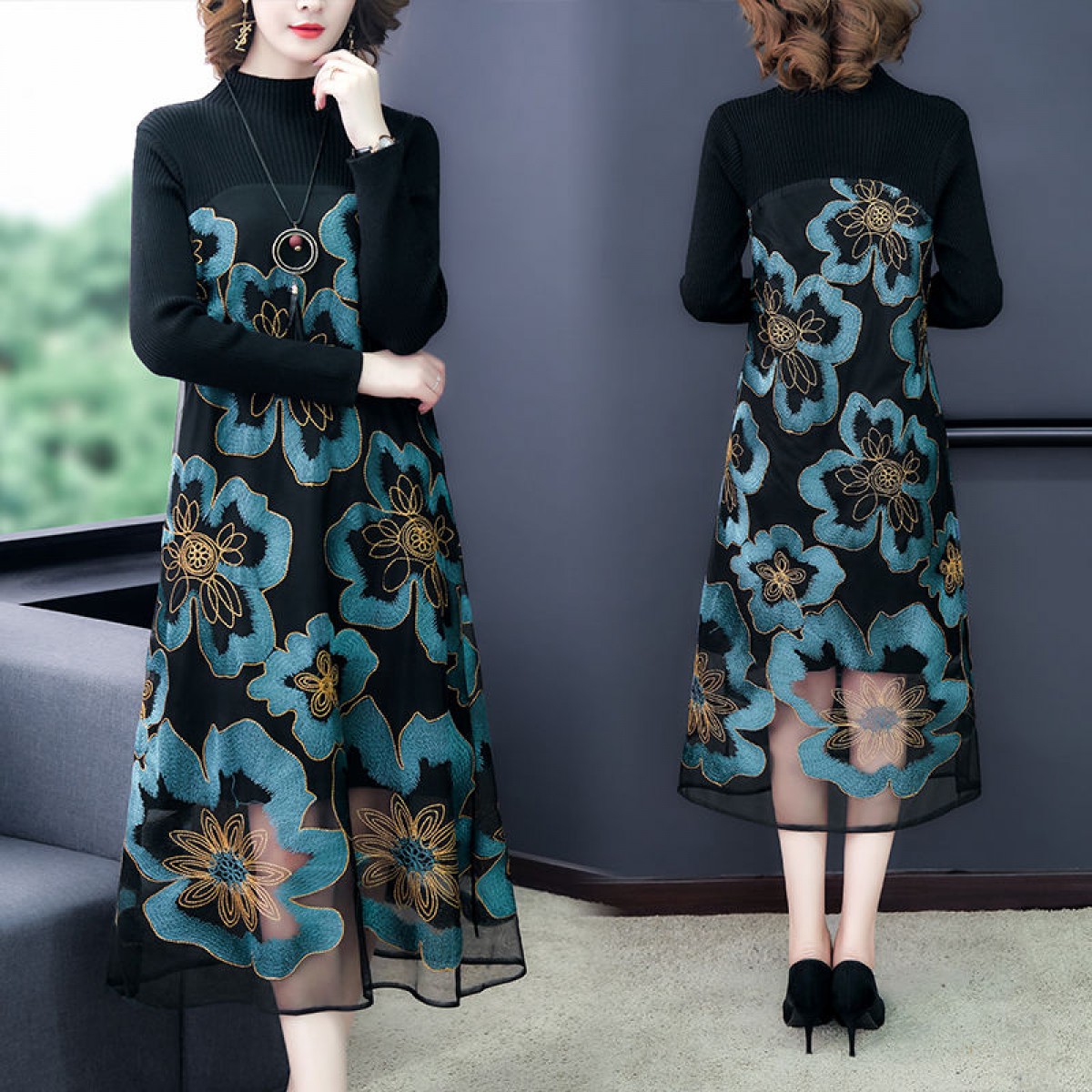 商品名稱:秋冬新款大碼女裝遮肚連衣裙長袖毛衣拼接網(wǎng)紗繡花連衣裙針織女裝