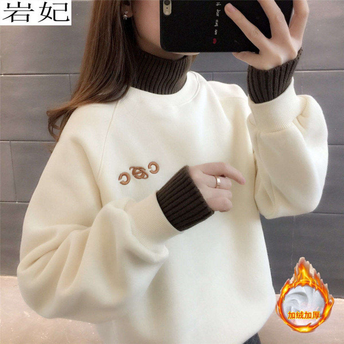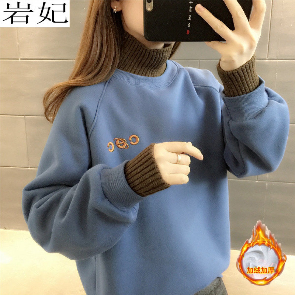 加絨衛(wèi)衣女2019秋冬新款半高領(lǐng)假兩件寬松韓版加厚時尚上衣外套潮
