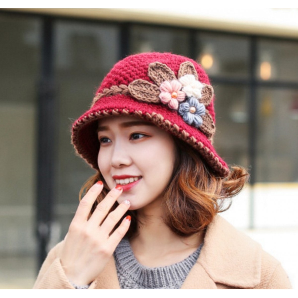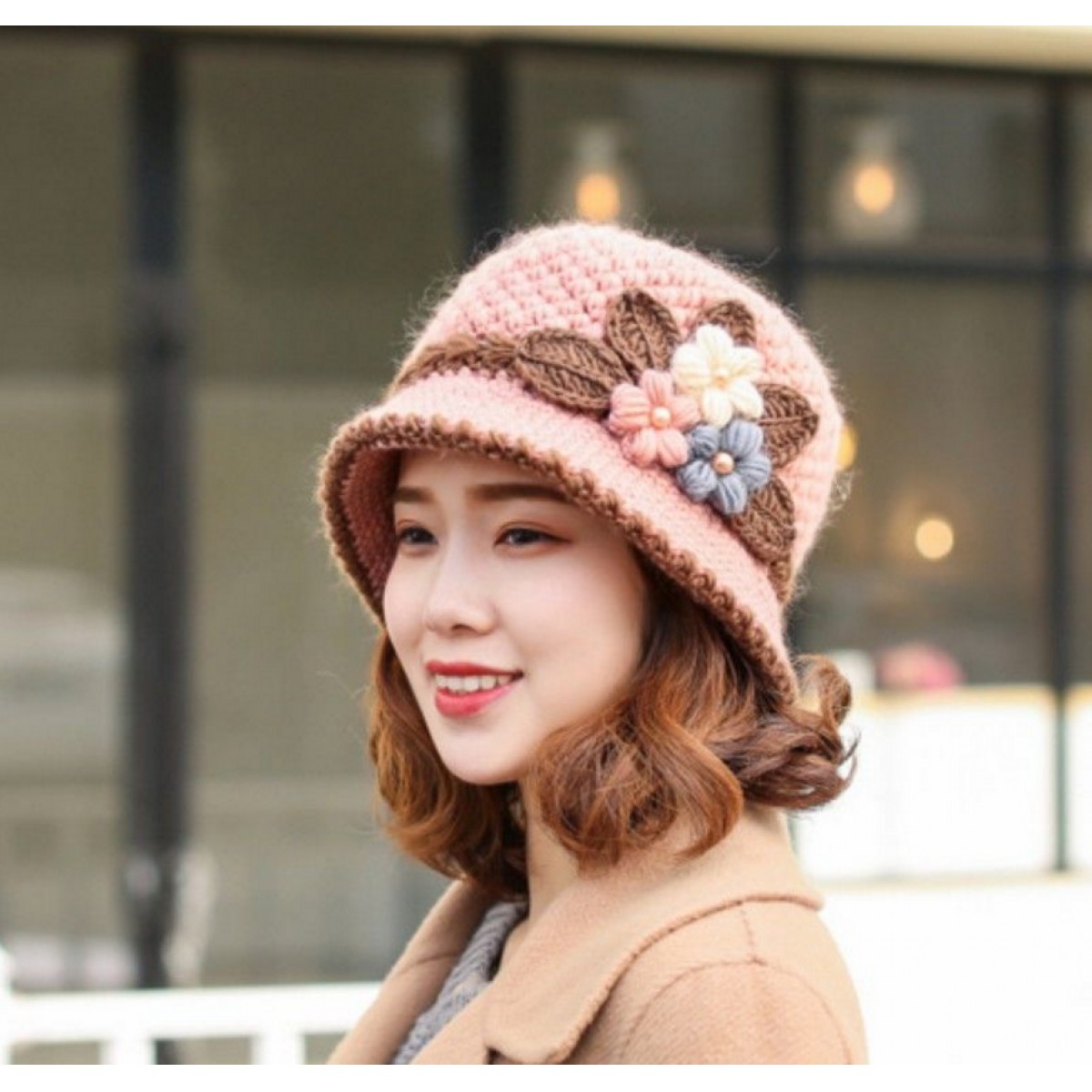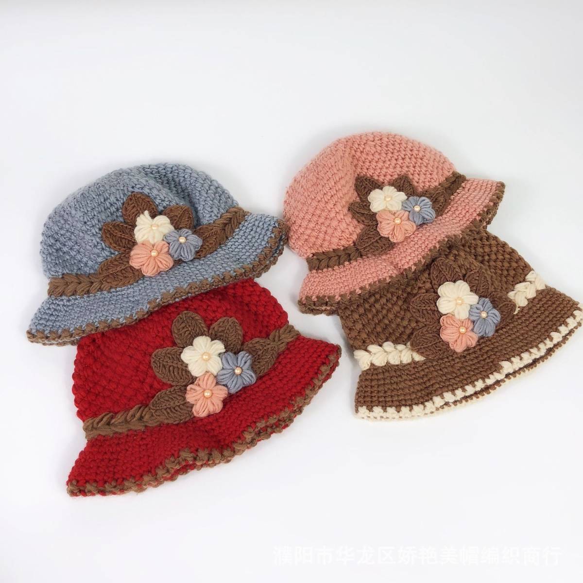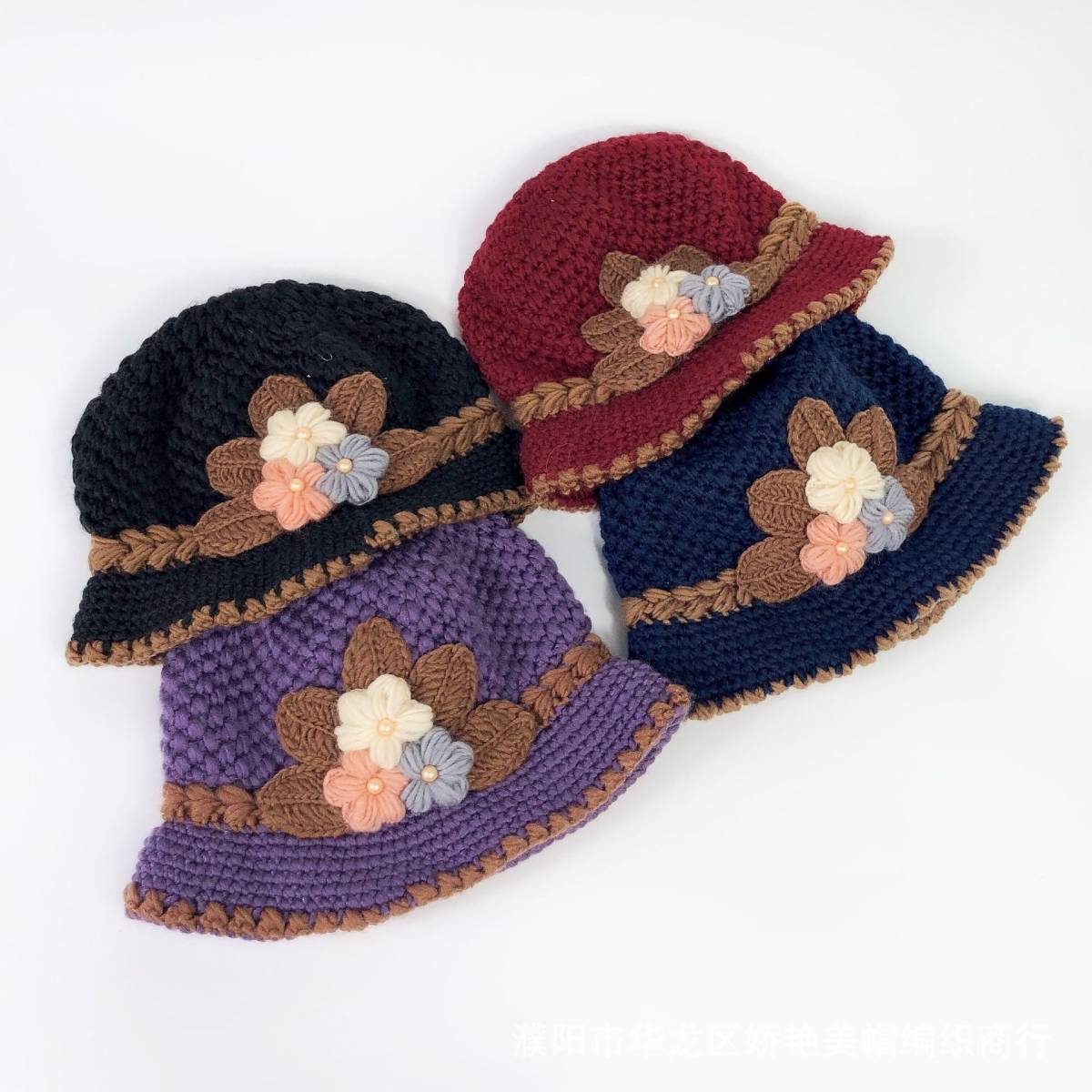 針織帽女士秋冬毛線帽經(jīng)典冬季女帽子花朵加絨漁夫帽盆帽媽媽冬帽