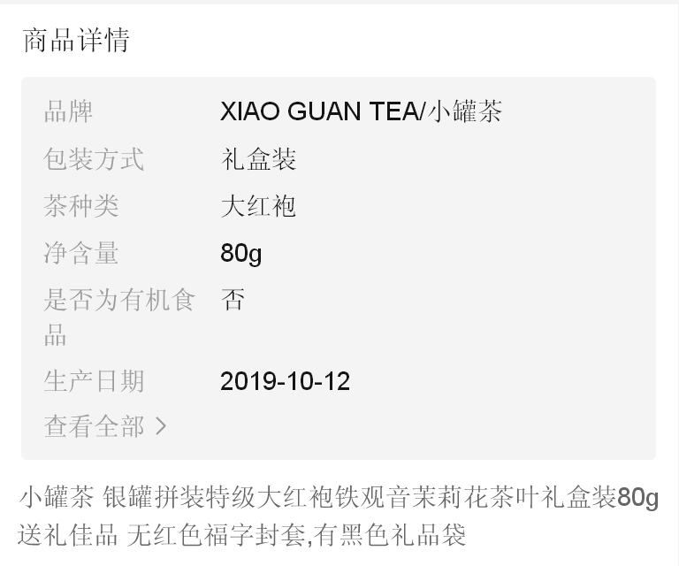 商品名稱:小罐茶年貨禮盒銀罐拼裝特級大紅袍鐵觀音茉莉花茶葉80g 送禮佳品