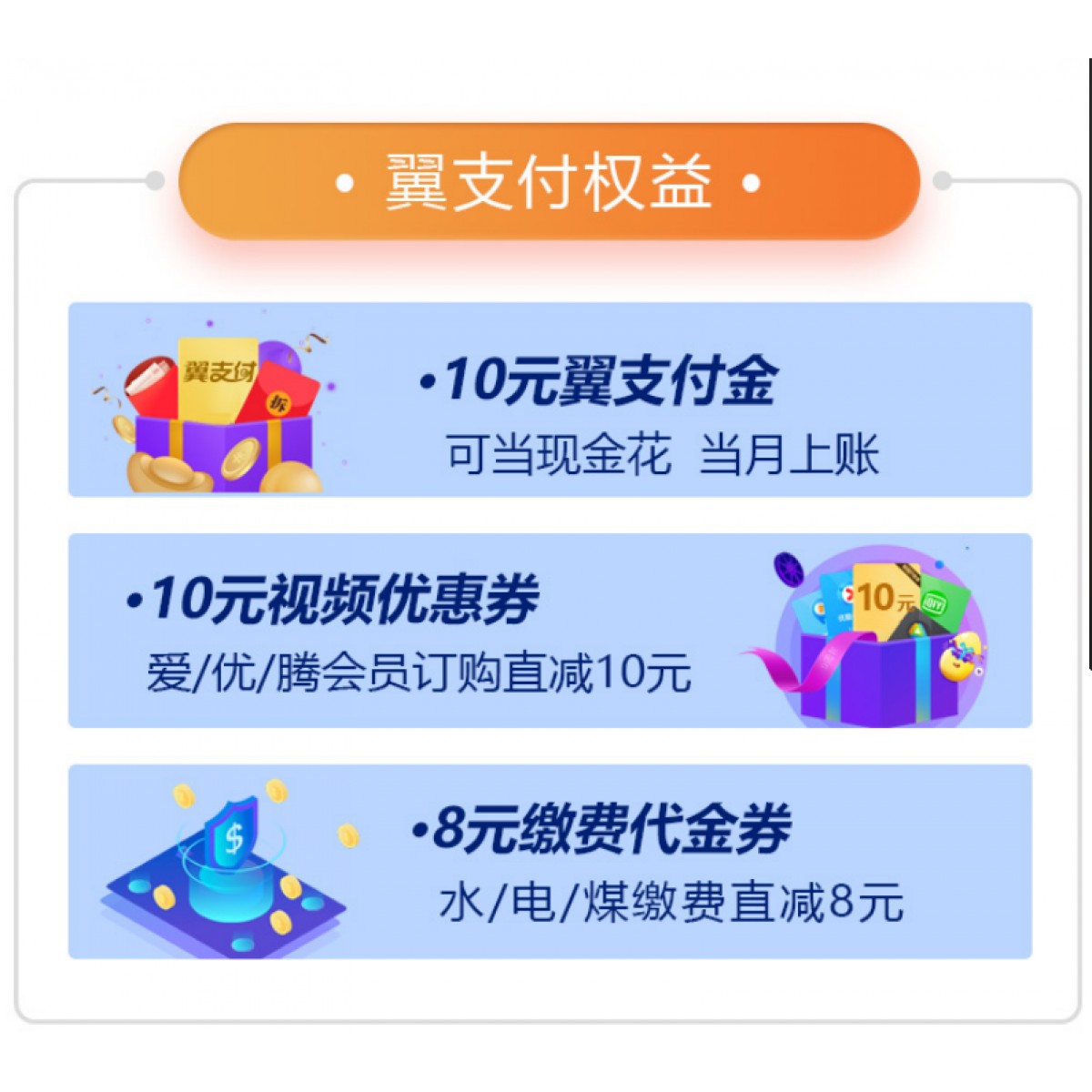 【 翼支付消費(fèi)權(quán)益】:下載翼支付APP。繳費(fèi)時 :贈送10元的話費(fèi)券,8元的電費(fèi)代金券、10元的視頻優(yōu)惠券。這三項都包括在20元翼支付權(quán)益里面,說白了就是用戶花20塊錢享受到28元的優(yōu)惠券?!?但這20元費(fèi)用是包括在129元的月租里面,不需要用戶再額外支付?!?/span>