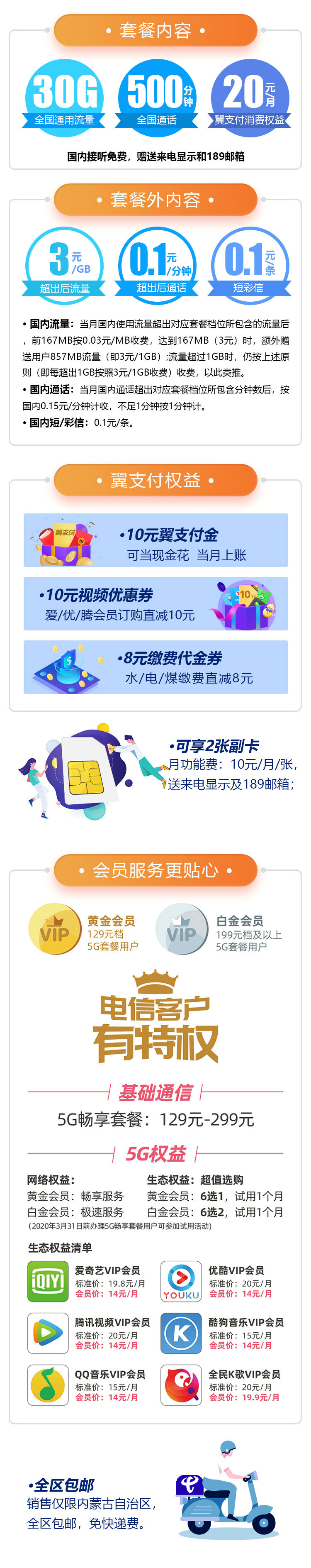 套餐內(nèi)容包括:30G全國通用流量、500分鐘全國通話、20元翼支付消費(fèi)權(quán)益、國內(nèi)接聽免費(fèi)、贈送來電顯和189郵箱。
