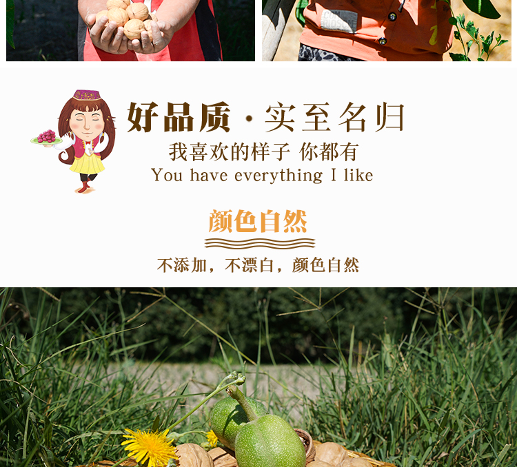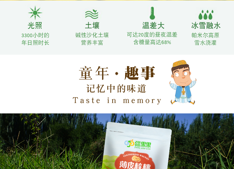 源自優(yōu)質(zhì)核桃產(chǎn)區(qū),清水清洗,天然晾曬,核桃外皮光滑干凈,殼薄易撥,果仁飽滿,因由雪水澆灌,加以日照充足,果肉不但不澀,細(xì)品有一股淡淡的清甜,是核桃中的佳品。