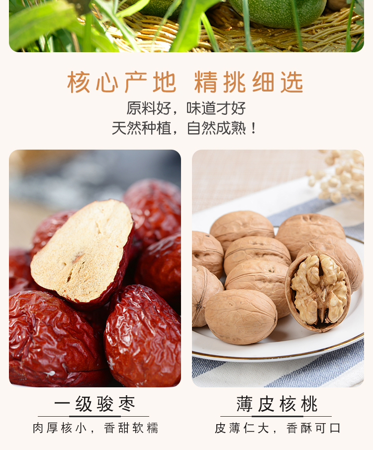 棗夾核桃臻選厚實(shí)棗肉,新鮮核桃仁,將紅棗的甜糯與核桃的香酥完美融合,美味升級(jí),營(yíng)養(yǎng)多樣,誘人的色澤,飽滿的肉質(zhì),吃起來超過癮;獨(dú)立包裝,便于攜帶,忘吃早餐來兩顆,提升活力來兩顆