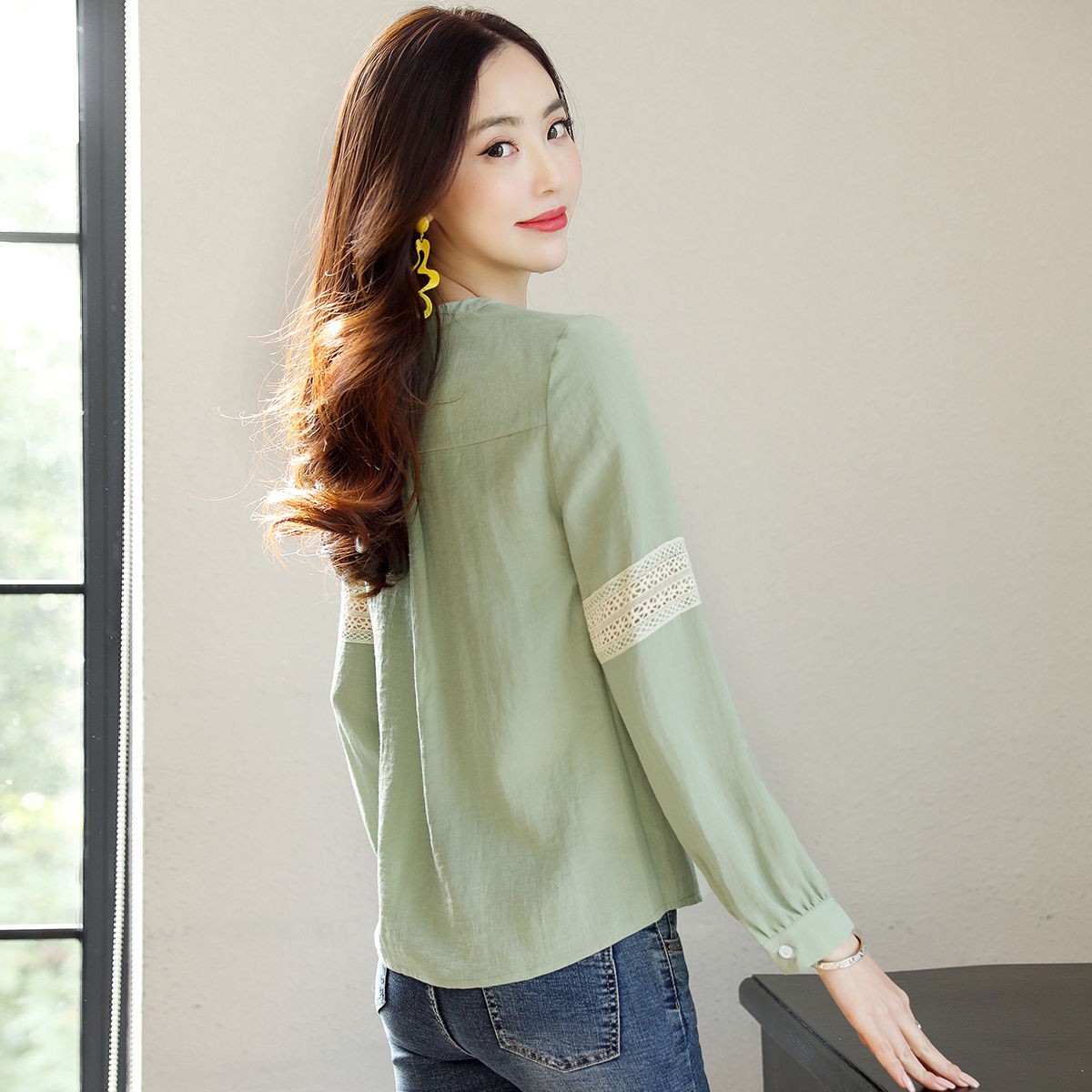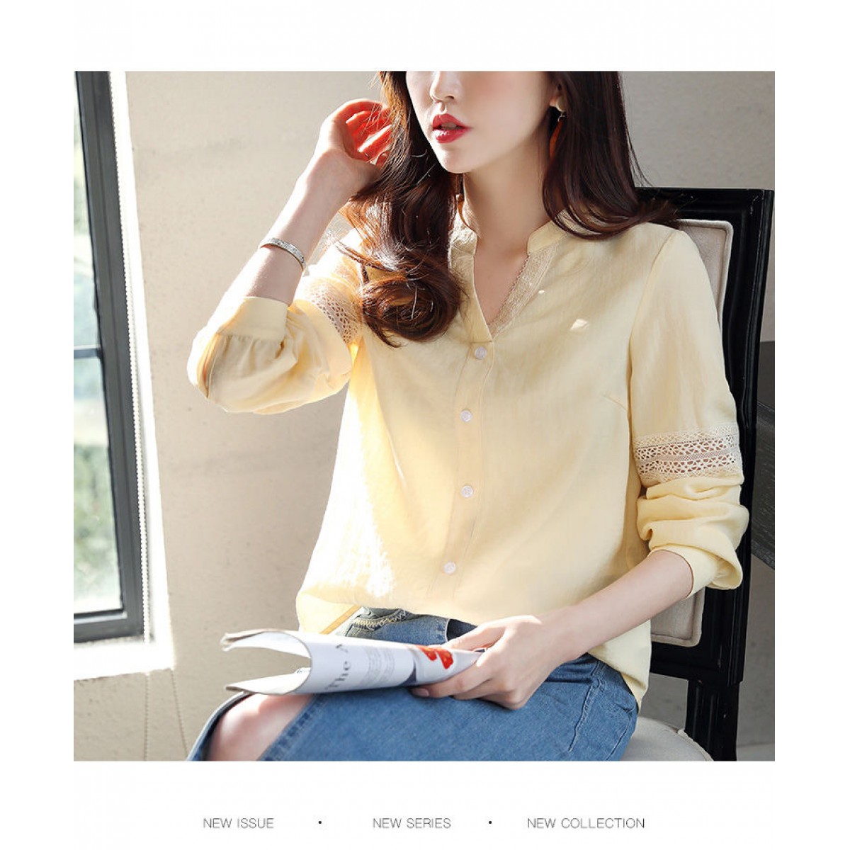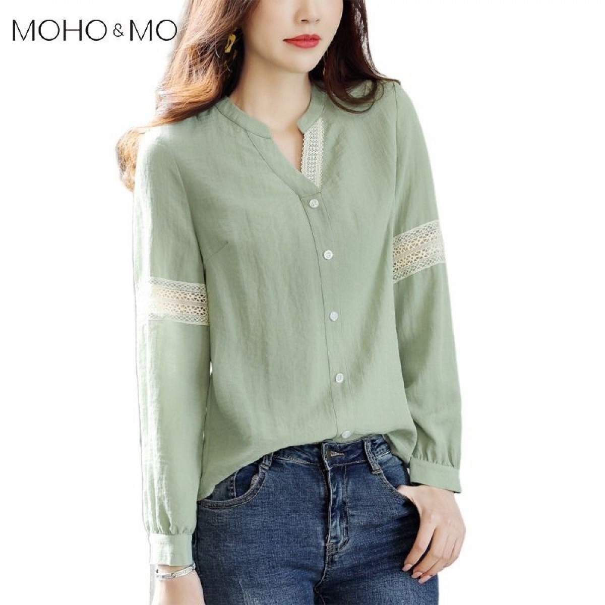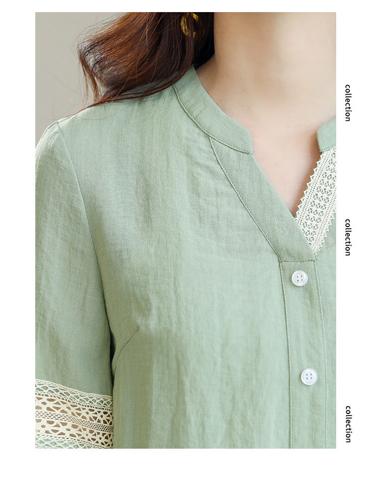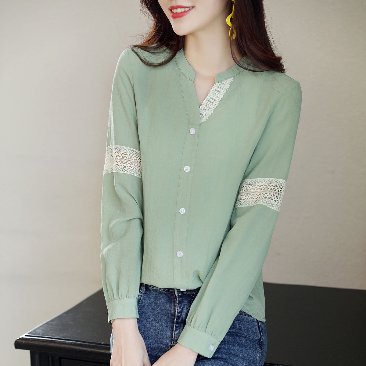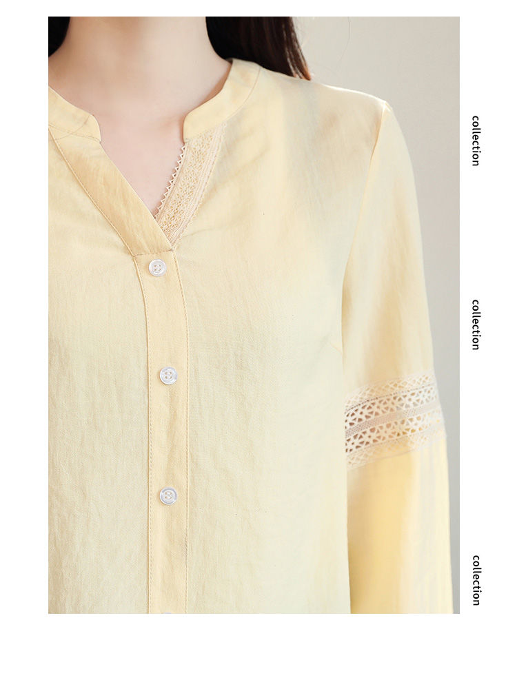 商品名稱:2020年春季新品女款韓版時(shí)尚百搭甜美拼接花邊V領(lǐng)襯衫