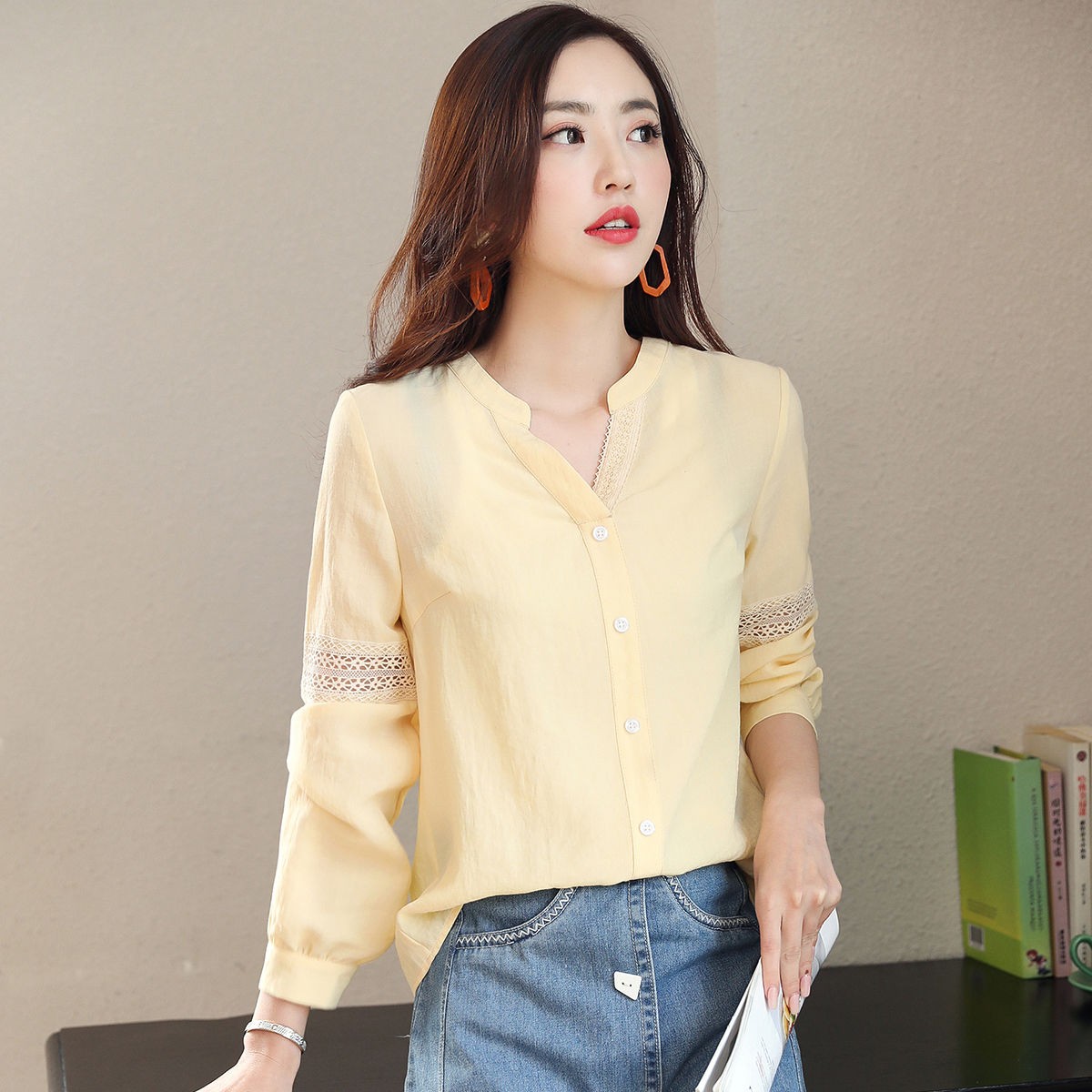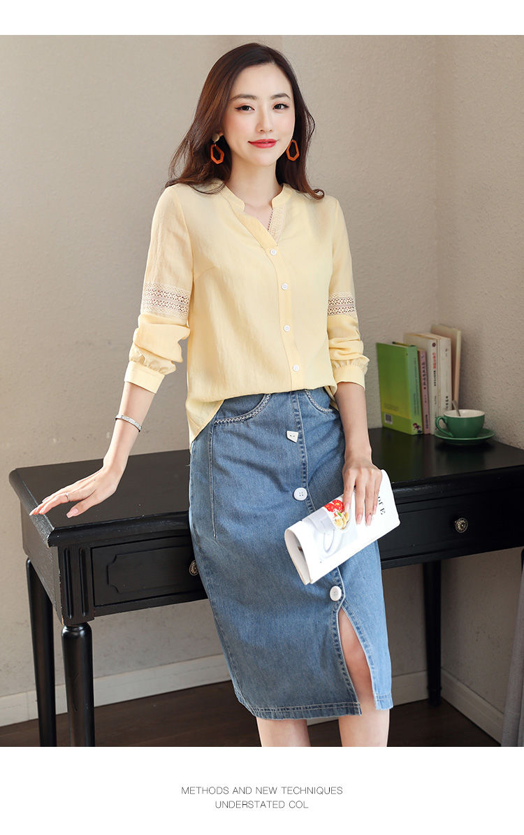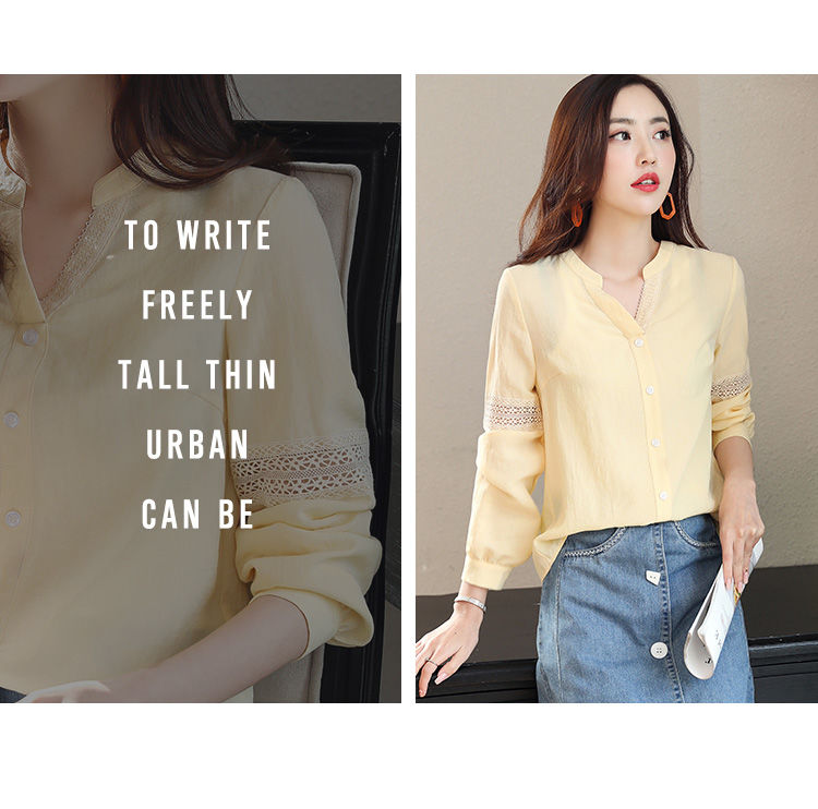 2020年春季新品女款韓版時(shí)尚百搭甜美拼接花邊V領(lǐng)襯衫