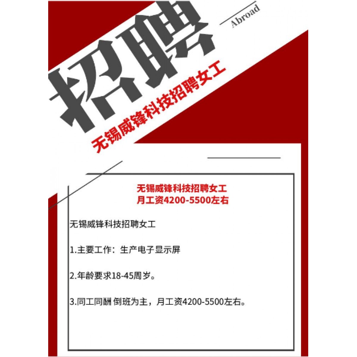 無錫威鋒科技招聘女工