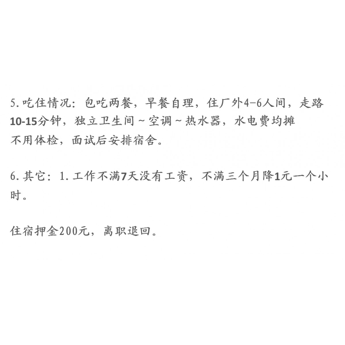 5.吃住情況:包吃兩餐,早餐自理,住廠外4-6人間,走路10-15分鐘,獨立衛(wèi)生間~空調~熱水器,水電費均攤