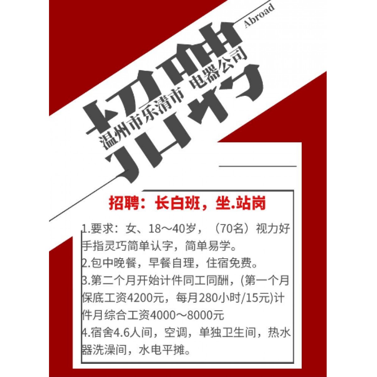 招聘:長(zhǎng)白班,坐.站崗位,
