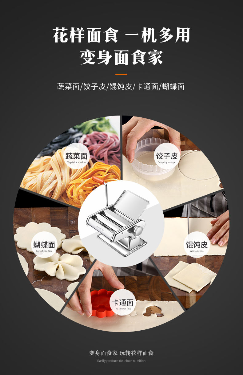 商品名稱:九陽面條機(jī)多功能壓面機(jī)家用小型手動(dòng)不銹鋼和面搟面餛飩餃皮子機(jī)