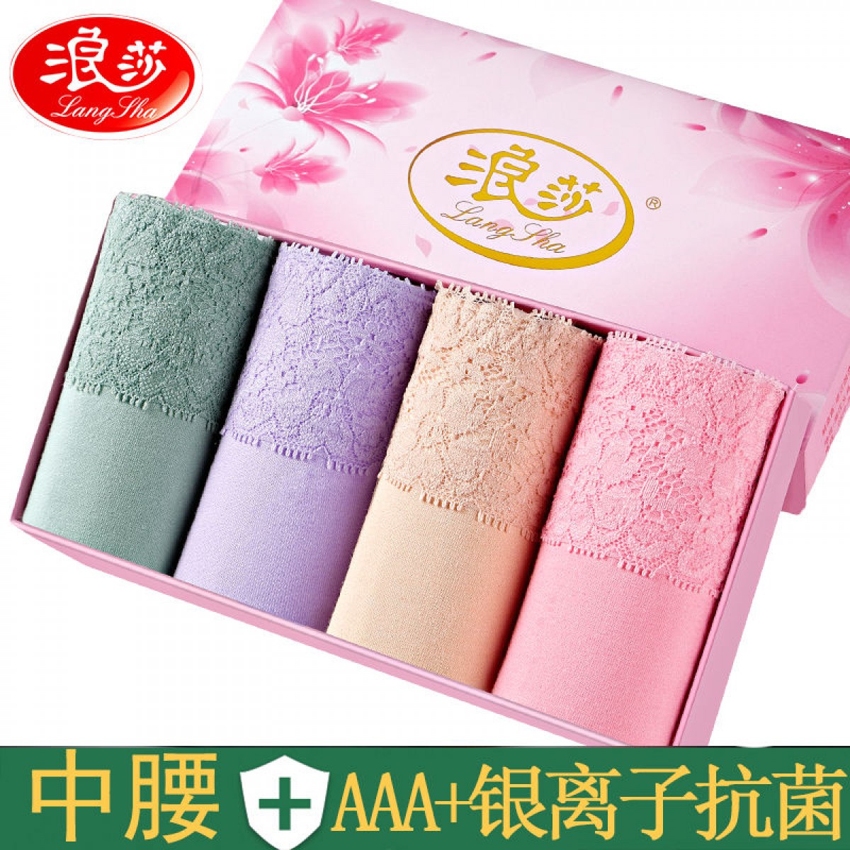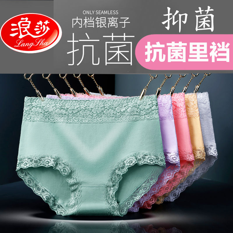 浪莎 4條 95%棉 中腰銀離子抗菌內(nèi)褲女蕾絲純色棉質(zhì)女士?jī)?nèi)褲