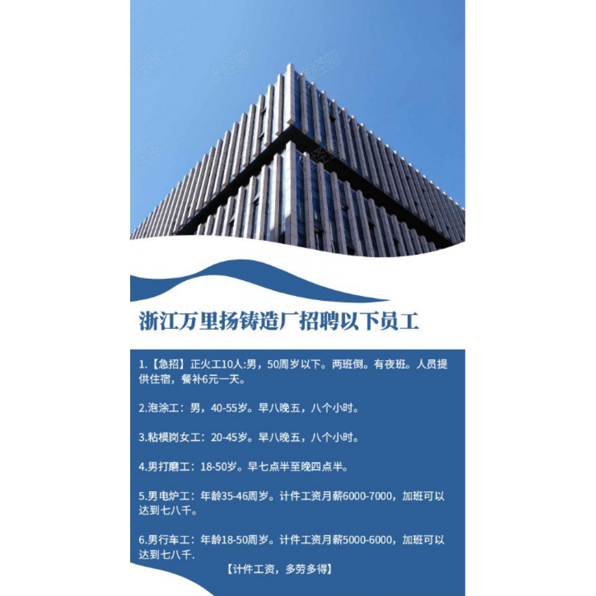 浙江萬里揚(yáng)鑄造廠上市公司?,F(xiàn)面向社會(huì)招聘以下員工。