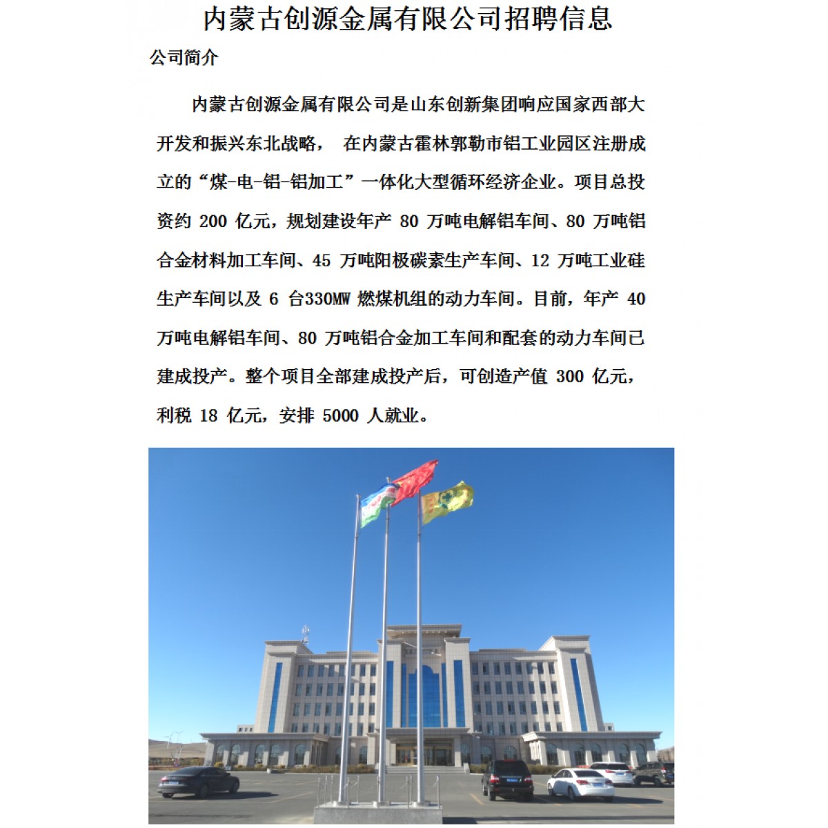 內蒙古創(chuàng)源金屬有限公司是山東創(chuàng)新集團響應國家西部大開發(fā)和振興東北戰(zhàn)略, 在內蒙古霍林郭勒市鋁工業(yè)園區(qū)注冊成立的“煤-電-鋁-鋁加工”一體化大型循環(huán)經(jīng)濟企業(yè)。項目總投資約 200 億元,規(guī)劃建設年產 80 萬噸電解鋁車間、80 萬噸鋁合金材料加工車間、45 萬噸陽極碳素生產車間、12 萬噸工業(yè)硅生產車間以及 6 臺330MW 燃煤機組的動力車間。目前,年產 40 萬噸電解鋁車間、80 萬噸鋁合金加工車間和配套的動力車間已建成投產。整個項目全部建成投產后,可創(chuàng)造產值 300 億元,利稅 18 億元,安排 5000 人就業(yè)。