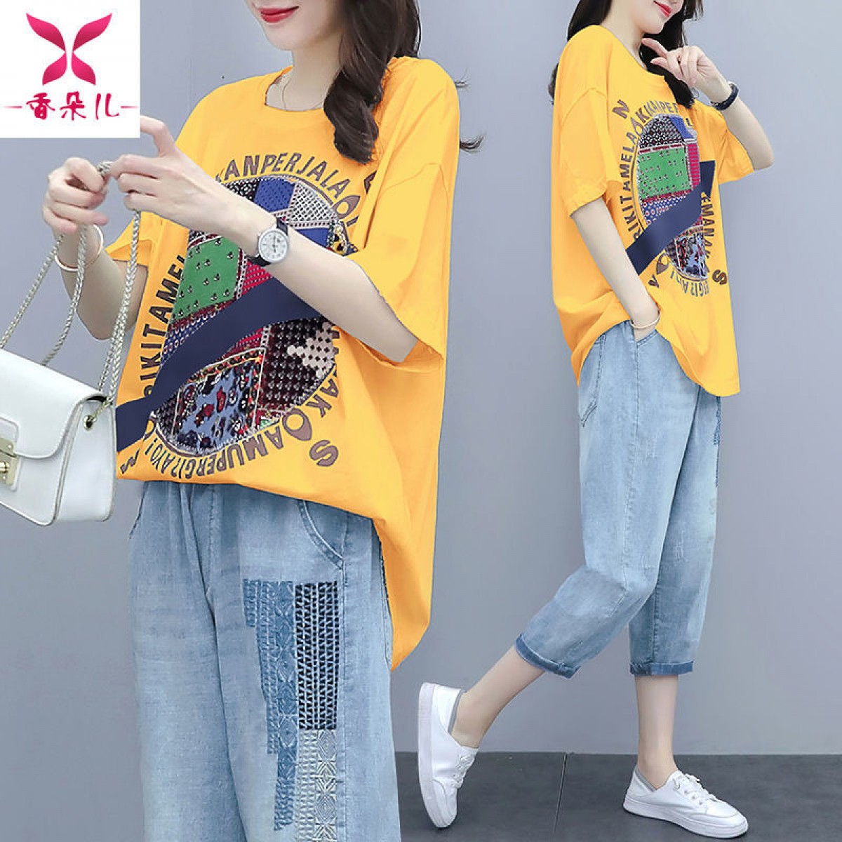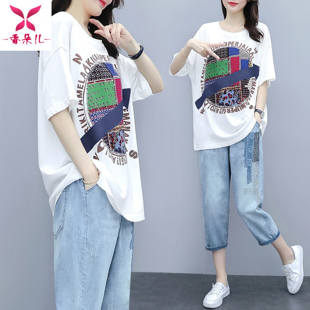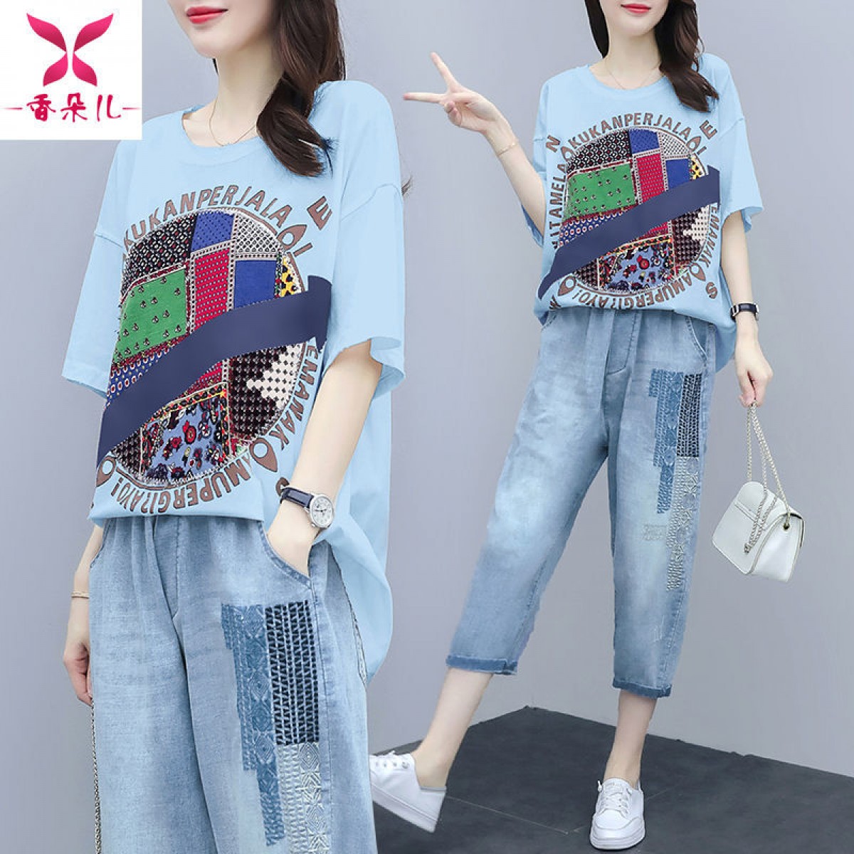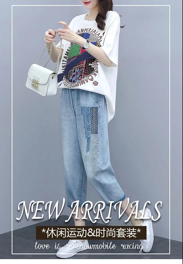 2020年夏季單/套裝新款韓版寬松大碼拼貼刺繡休閑時尚套裝女夏裝