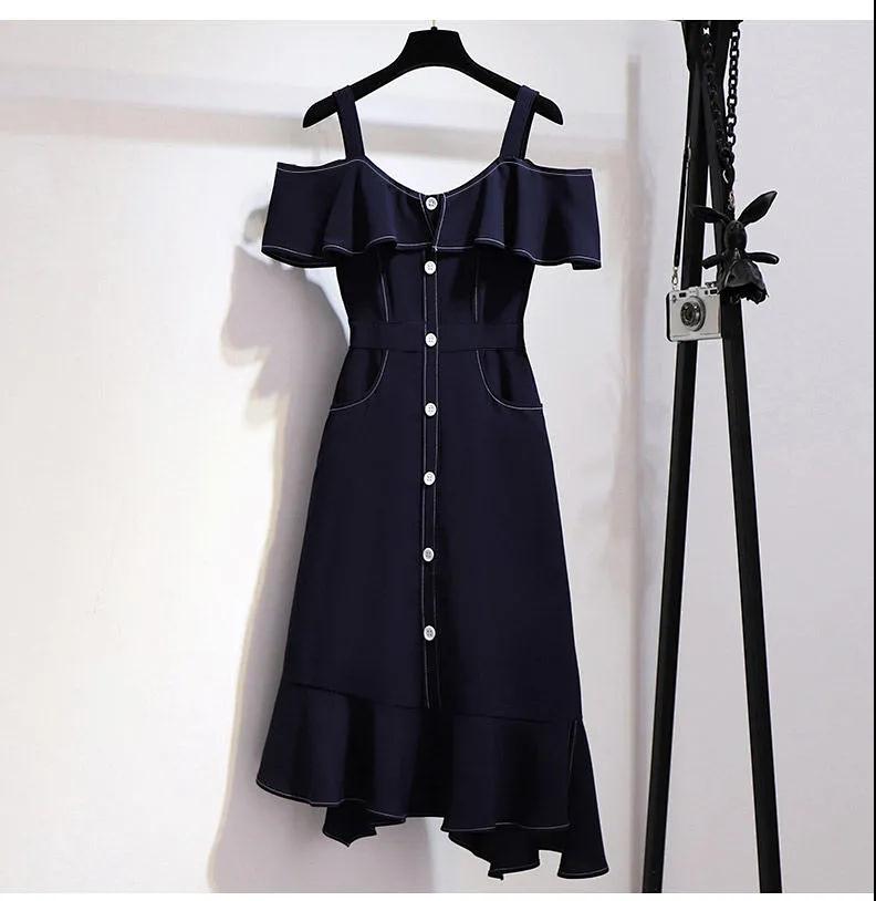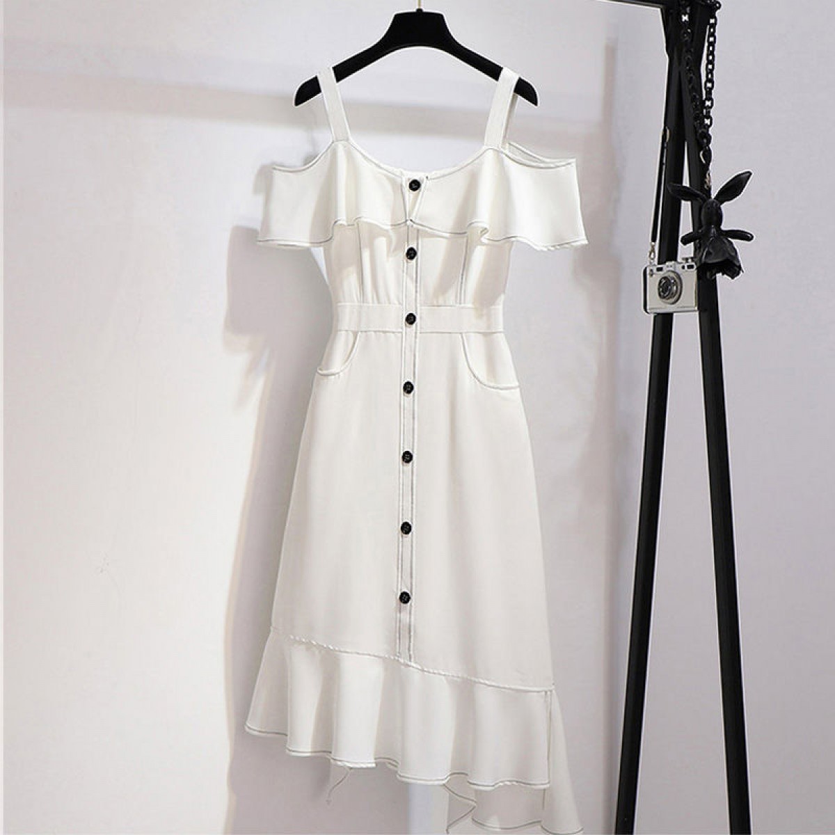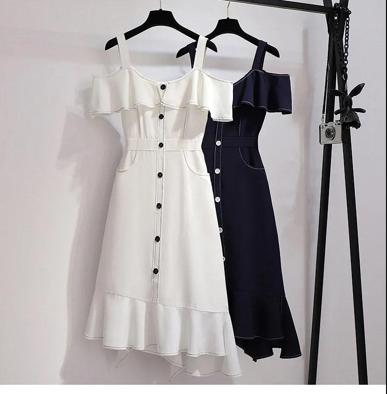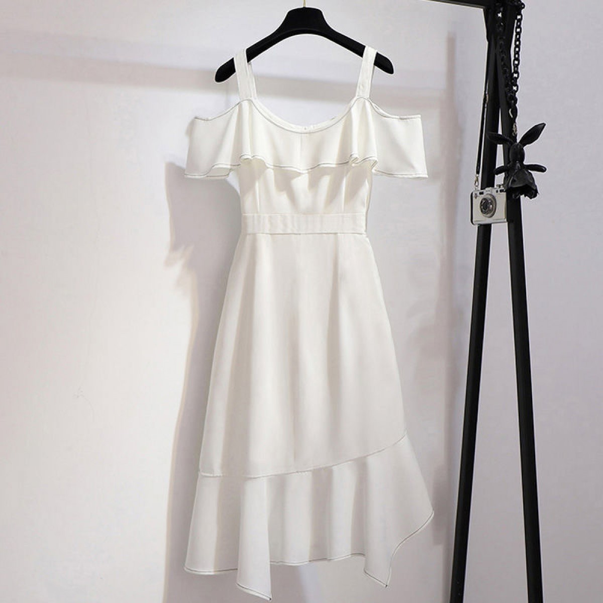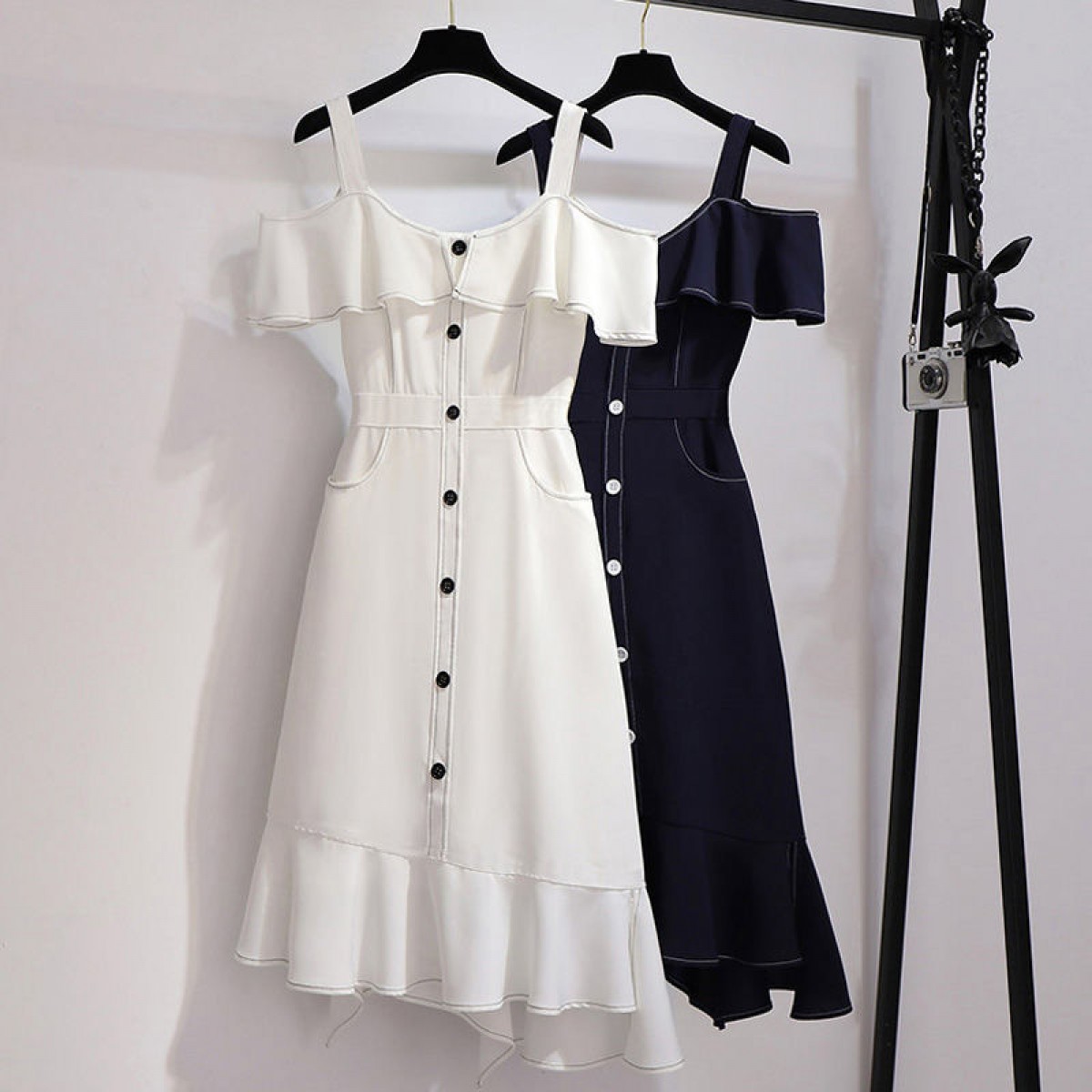 商品名稱:大碼女裝2020新款夏季一字肩氣質(zhì)收腰顯瘦胖妹妹不規(guī)則背帶連衣裙