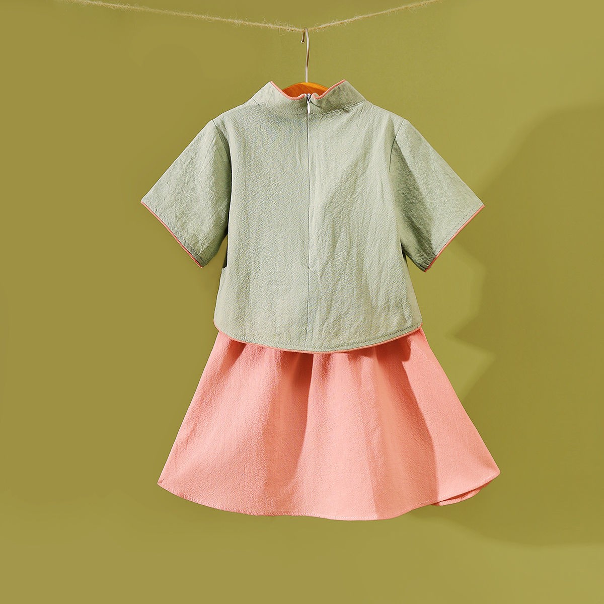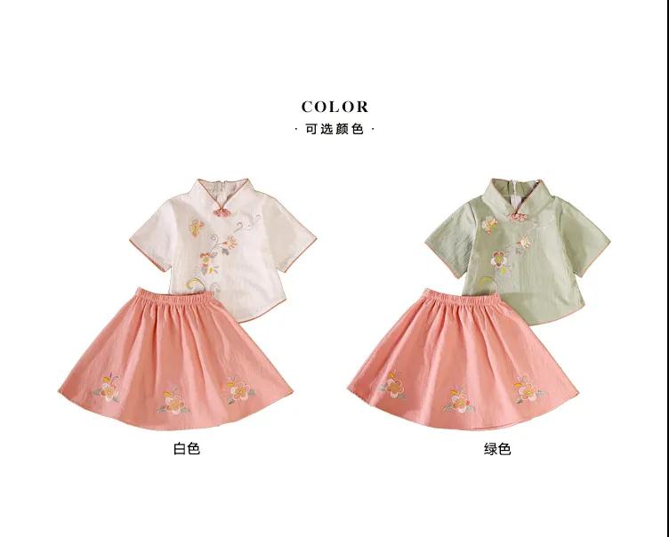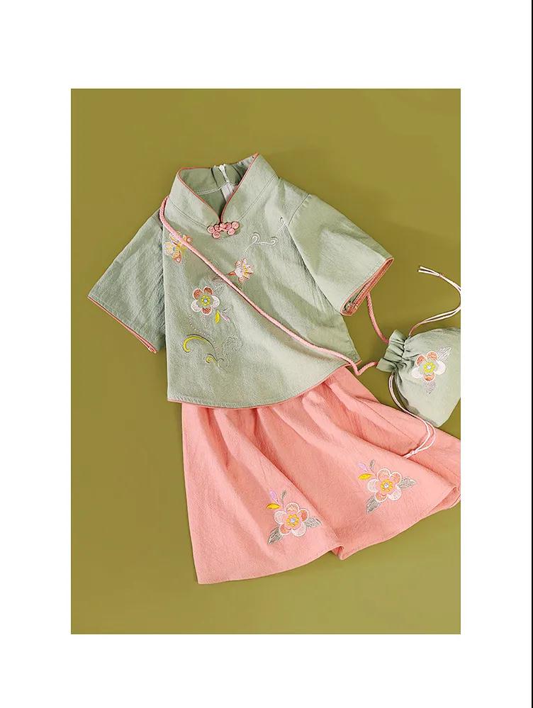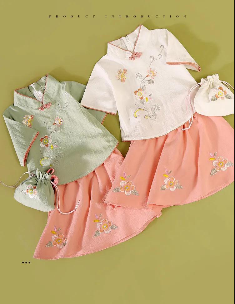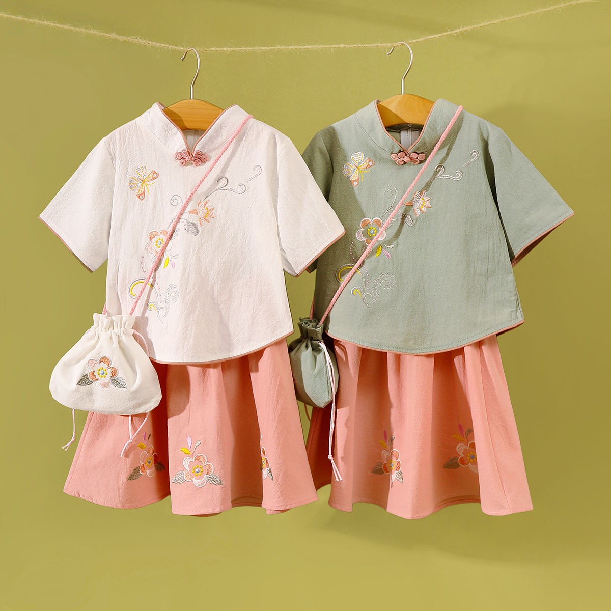 童裝女童中國風(fēng)春夏新款中童中式復(fù)古旗袍刺繡兒童漢服套裝