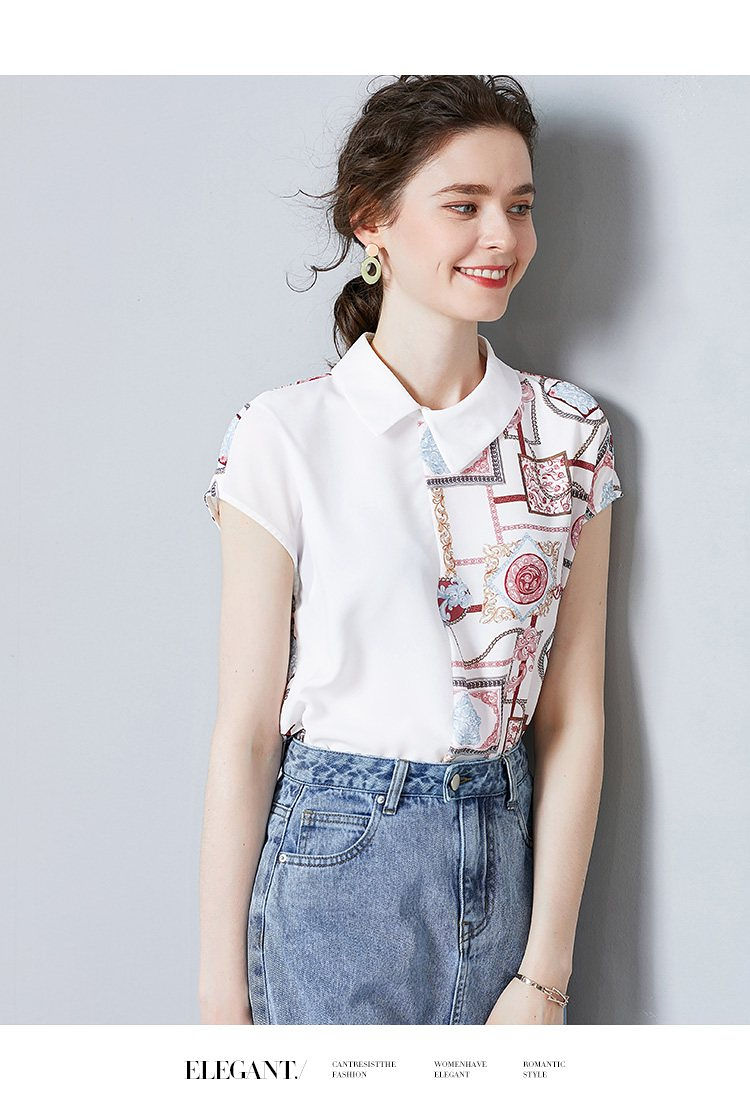 2020年夏季新款女士休閑簡約時尚雪紡印花拼接不對稱領子襯衫