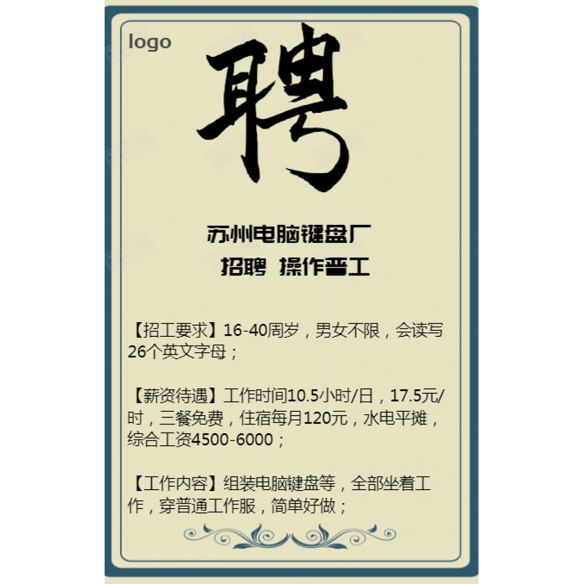 蘇州電腦鍵盤廠 招聘崗位 操作普工;