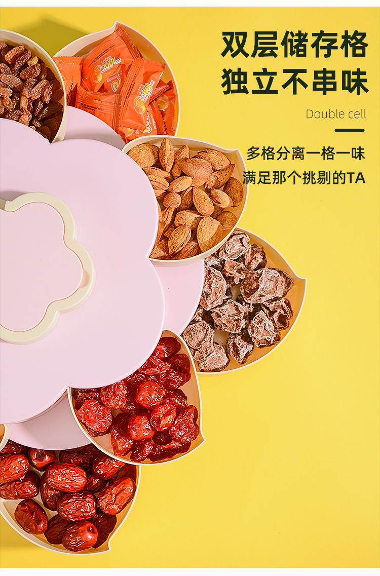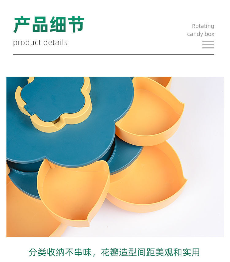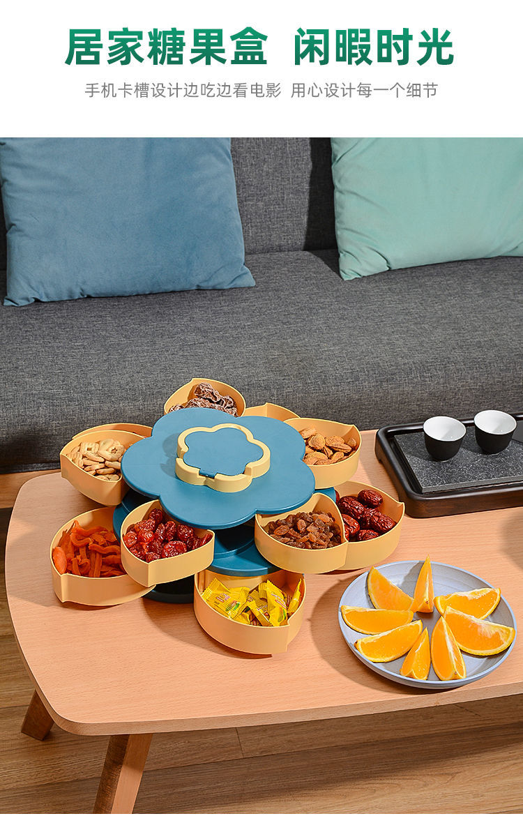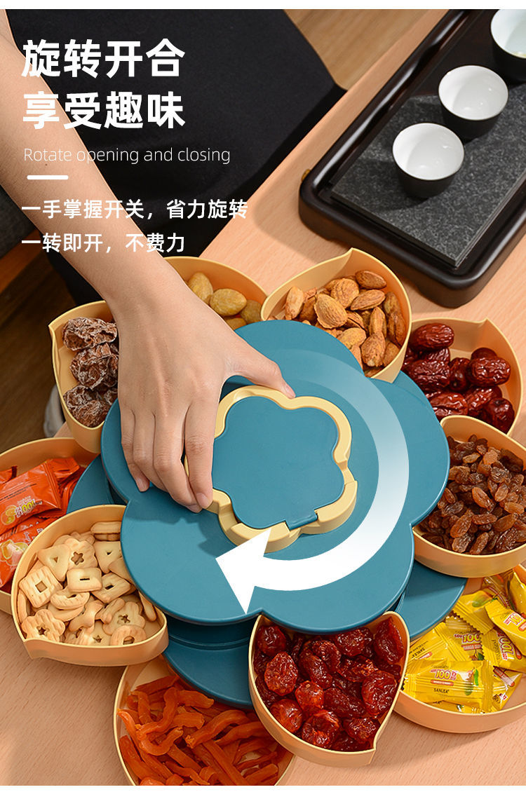商品名稱:糖果盒旋轉(zhuǎn)花朵客廳家用干果堅果零食盒帶蓋分格茶幾果盤多格果盒