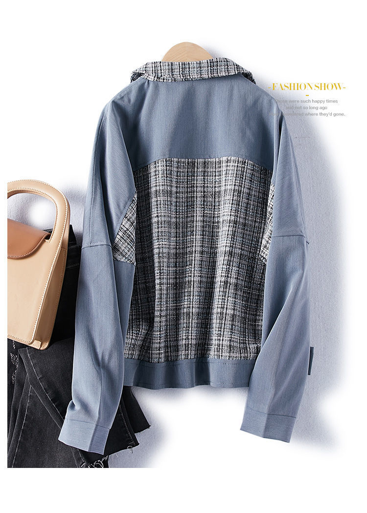 2021年春季新款女款時尚簡約百搭顯瘦純色拼接格紋小香風(fēng)外套