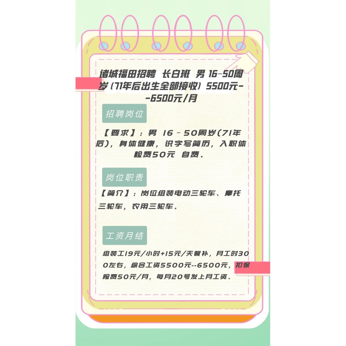 諸城福田招聘啦! 天天面試 省內(nèi)無(wú)需做核酸,省外需要到企業(yè)免費(fèi)做核酸 長(zhǎng)白班長(zhǎng)白班。