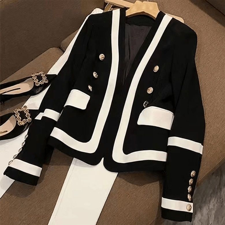 歐貨黑白撞色西裝女早秋新款高級感輕奢金屬排扣百搭小香風(fēng)外套