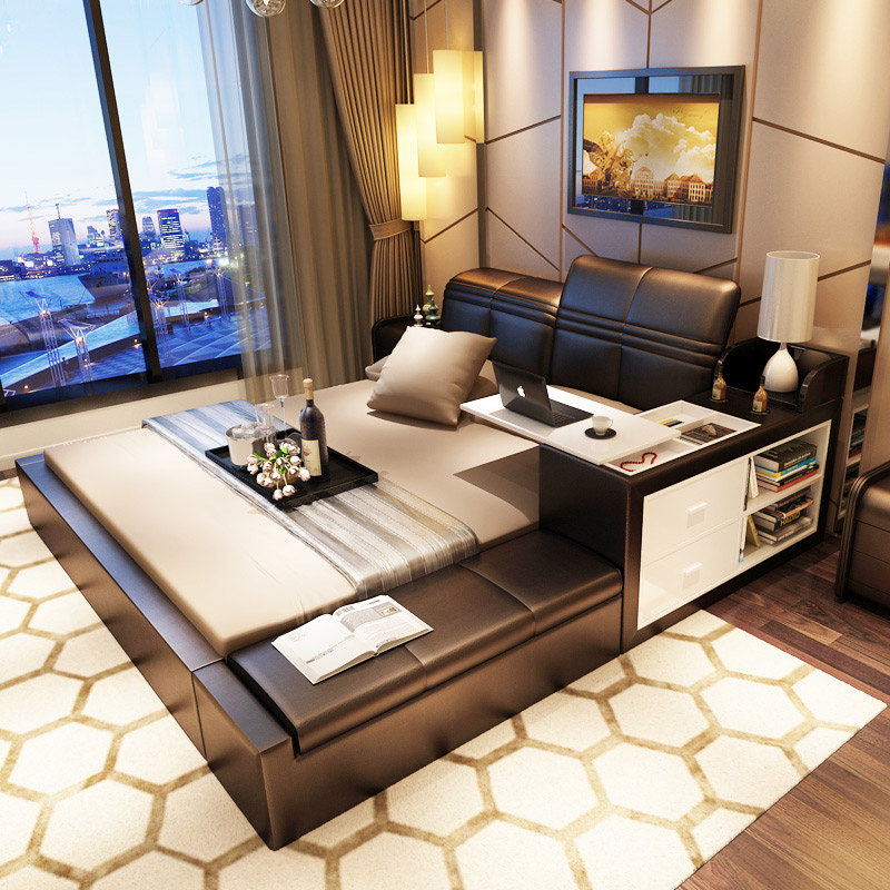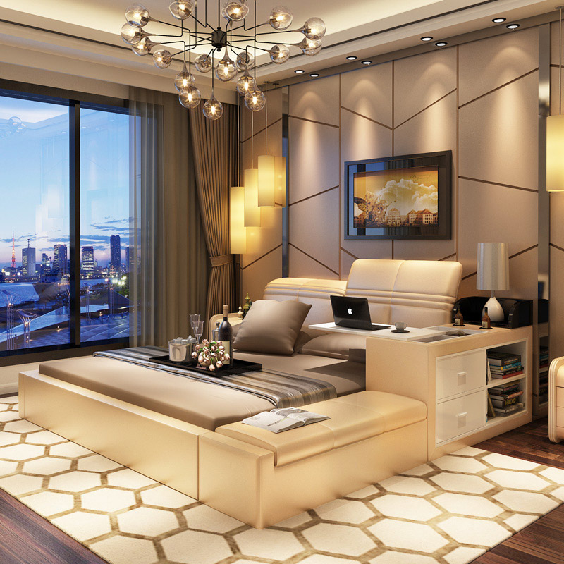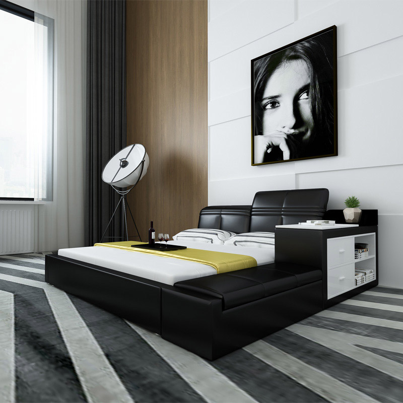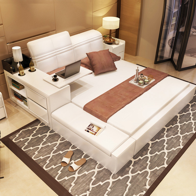 創(chuàng)意真皮床雙人床現(xiàn)代婚床1.8米1.5榻榻米床儲物床皮藝床軟床大床 床側(cè)儲物 升降靠背 雙ll價格 更低